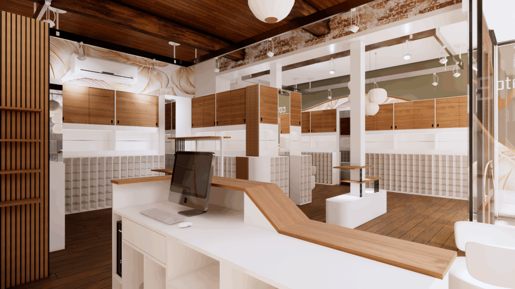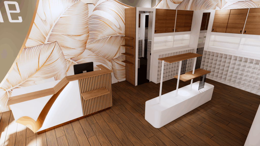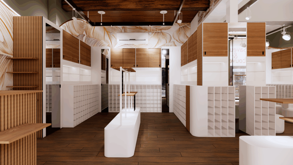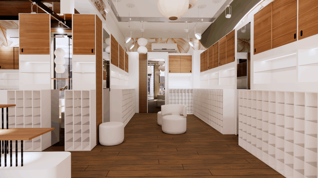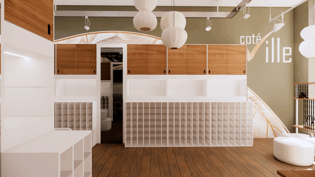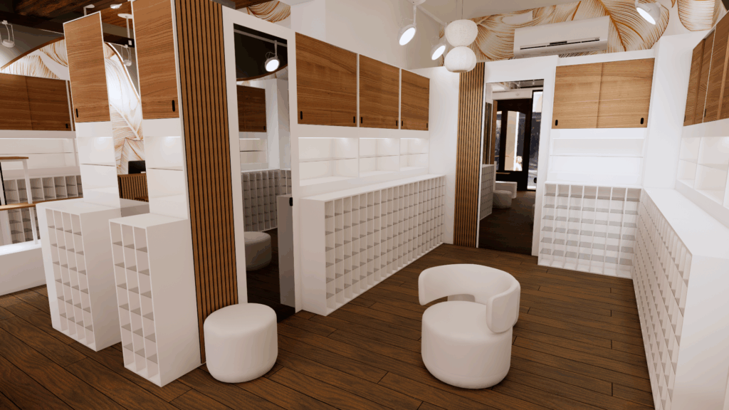 Les meubles ont été pensés sur-mesure pour répondre aux besoins du commanditaire quant à l'exposition des modèles et à la praticité pour les clients de choisir leur pointure sans demander l'aide d'un vendeur. Les meubles devaient également penser un stockage pour les boites. Le comptoir a été personnalisé en fonction de l'enseigne et pensé en fonction de l'ambiance générale. La décoration a été choisie en lien avec l'identité graphique de la marque existante.