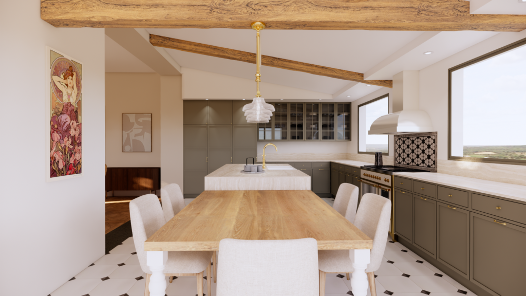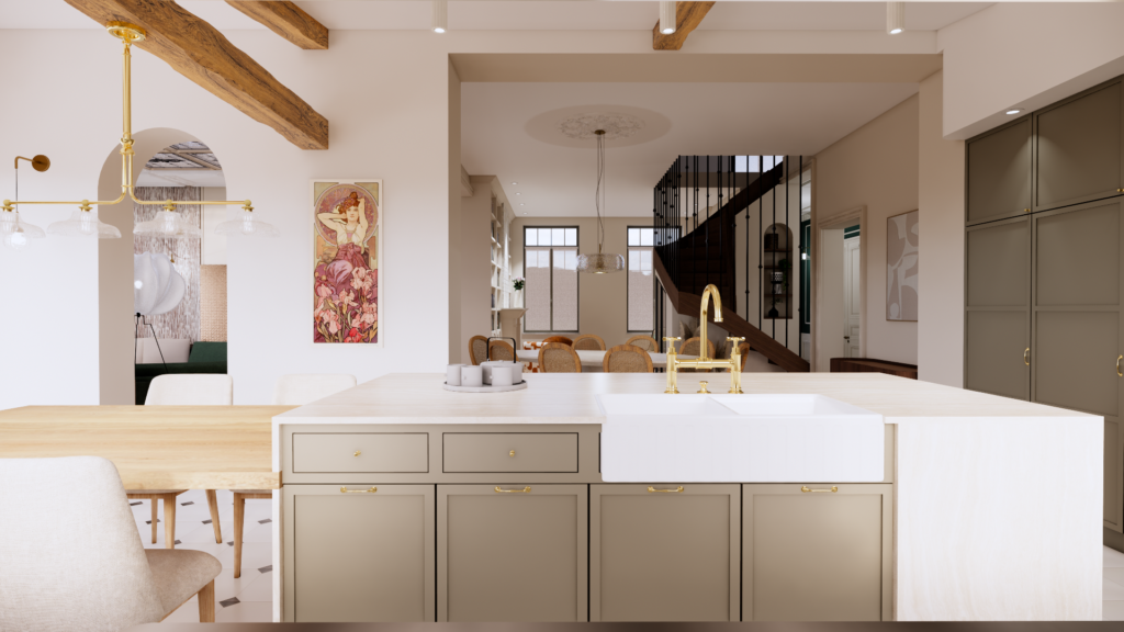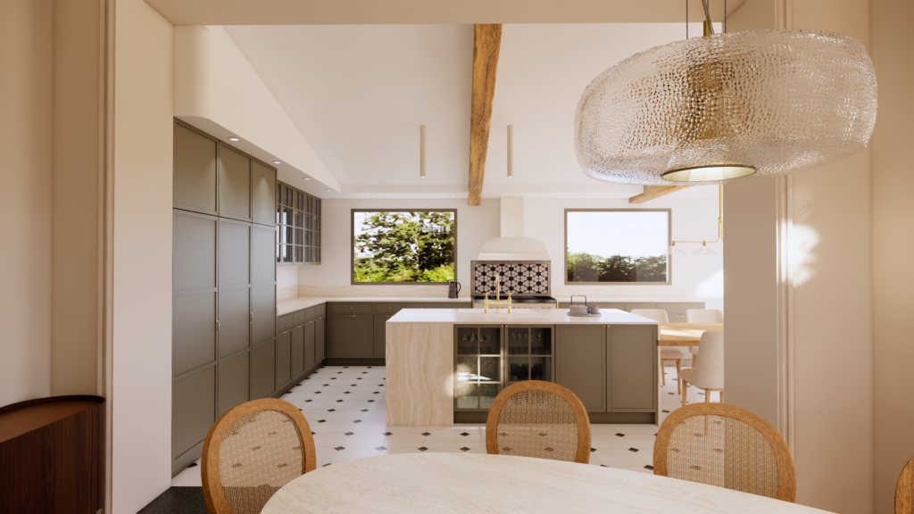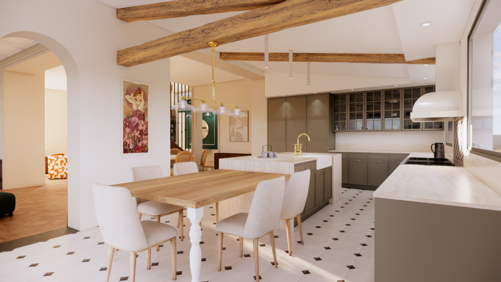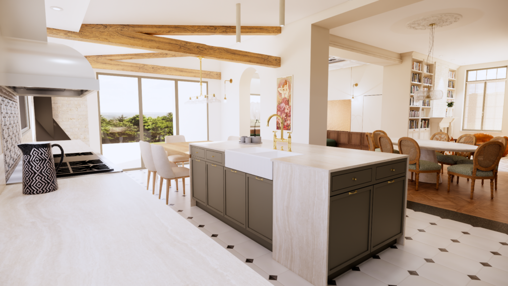 Mon accompagnement a concerné la refonte de la totalité du rez-de-chaussée de cette maison. La cliente avait en tête d'avoir la cuisine comme pièce centrale de l'habitation. Nous l'avons donc envisagé dans une extension de la maison pour qu'elle soit lumineuse tout au long de la journée et qu'elle puisse profiter à chaque membre de la famille avec un espace table à hauteur d'assise normale.