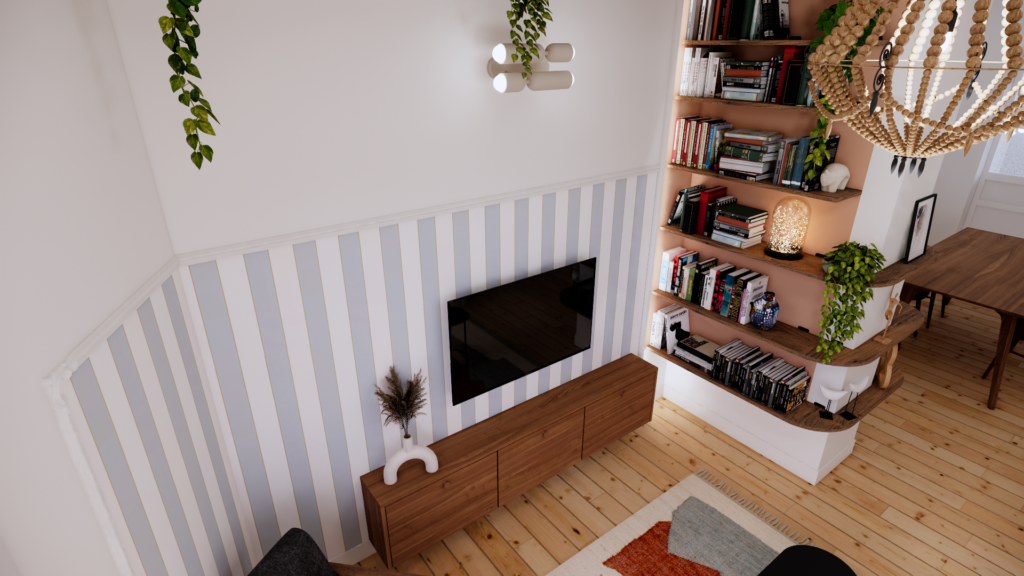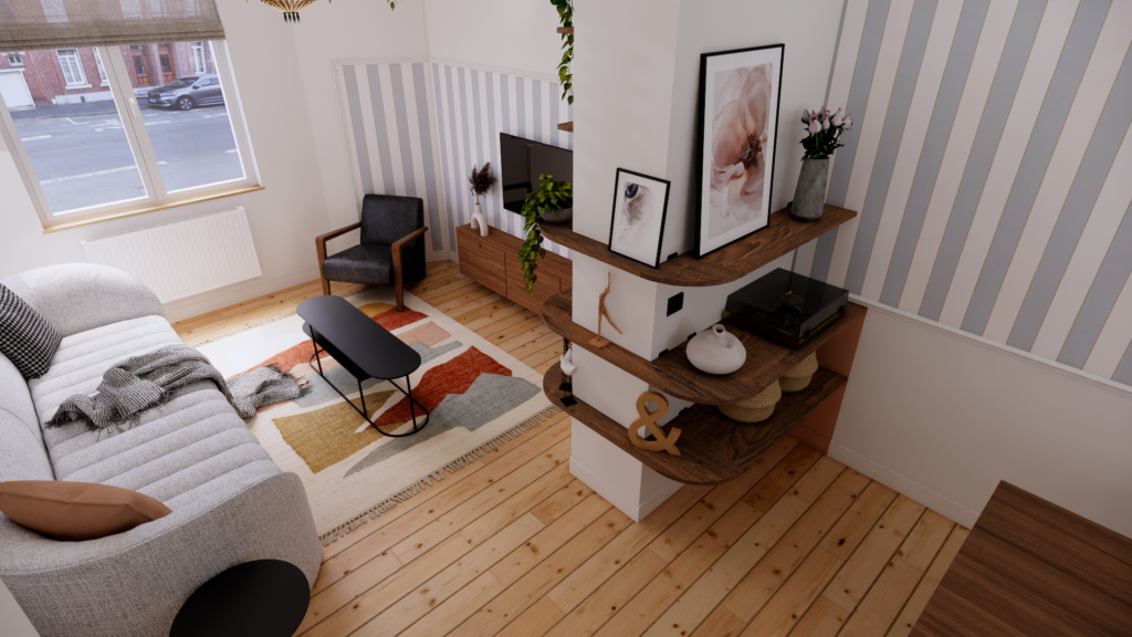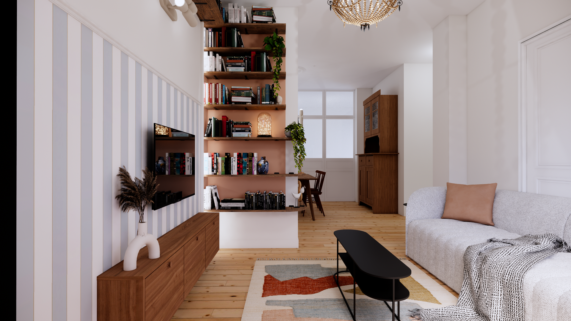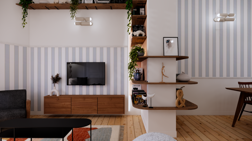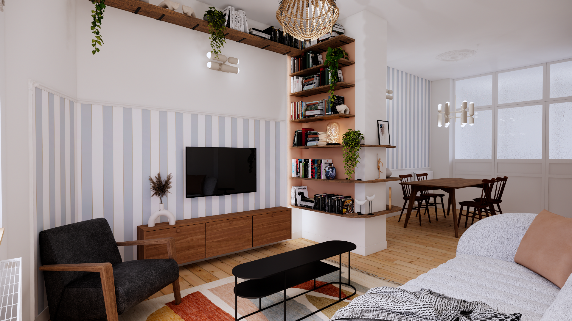 Aménager et décorer leur espace TV tout en faisant le lien vers la salle à manger (poteau à contourner).