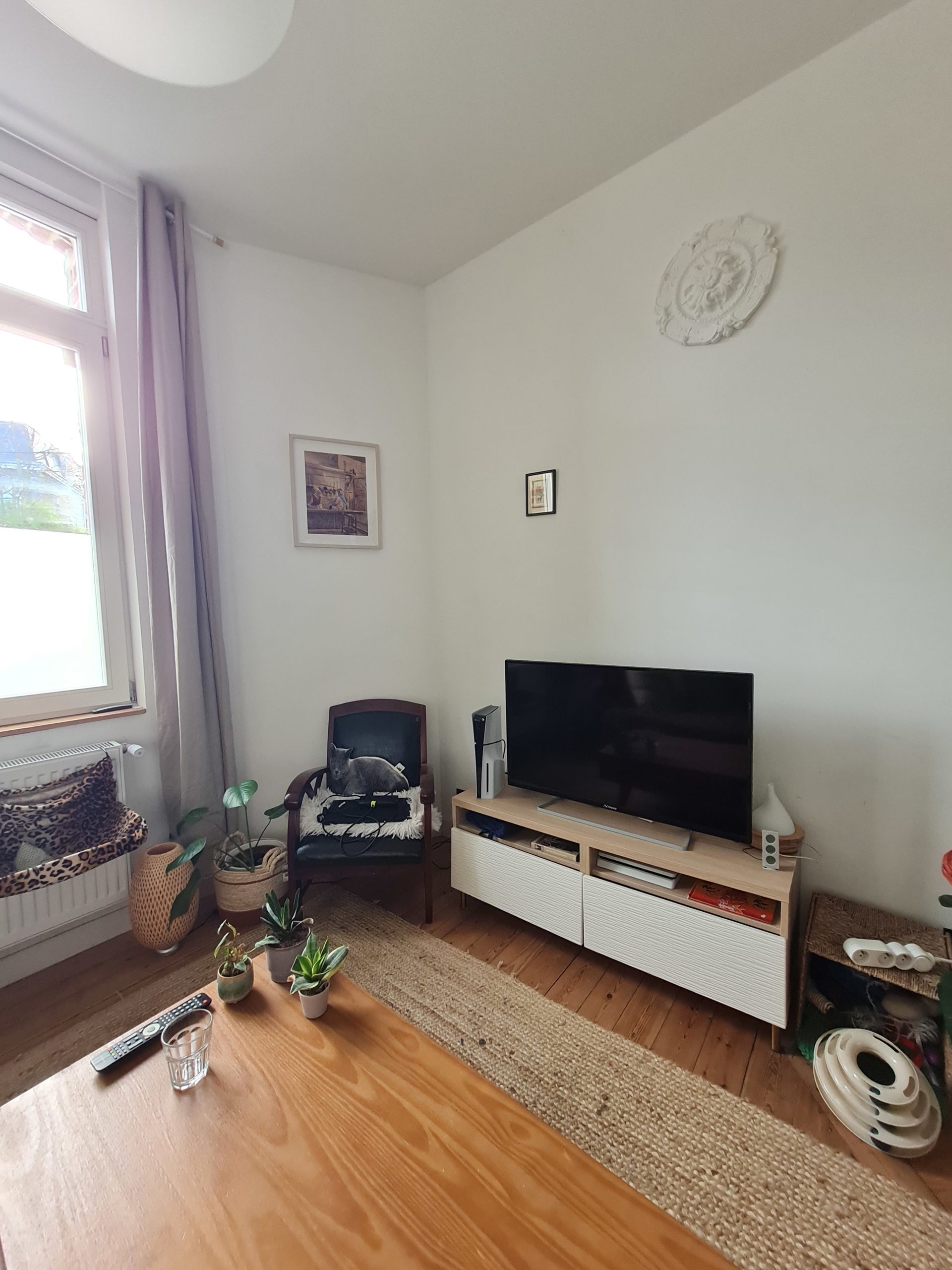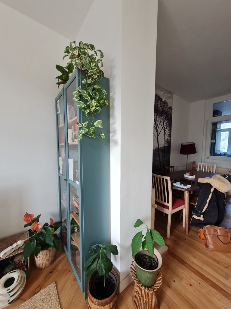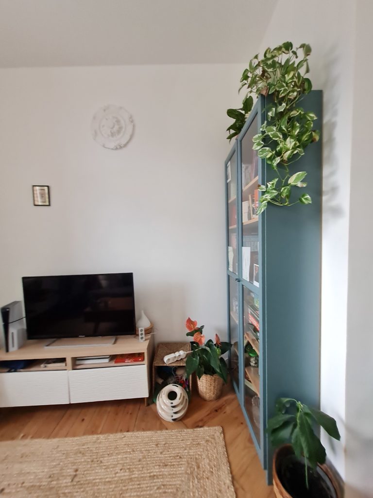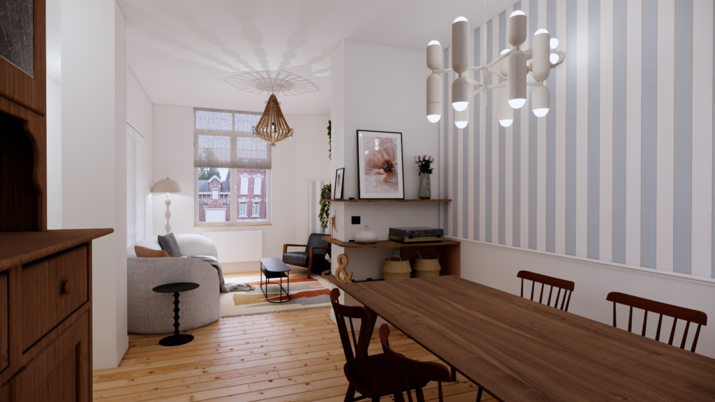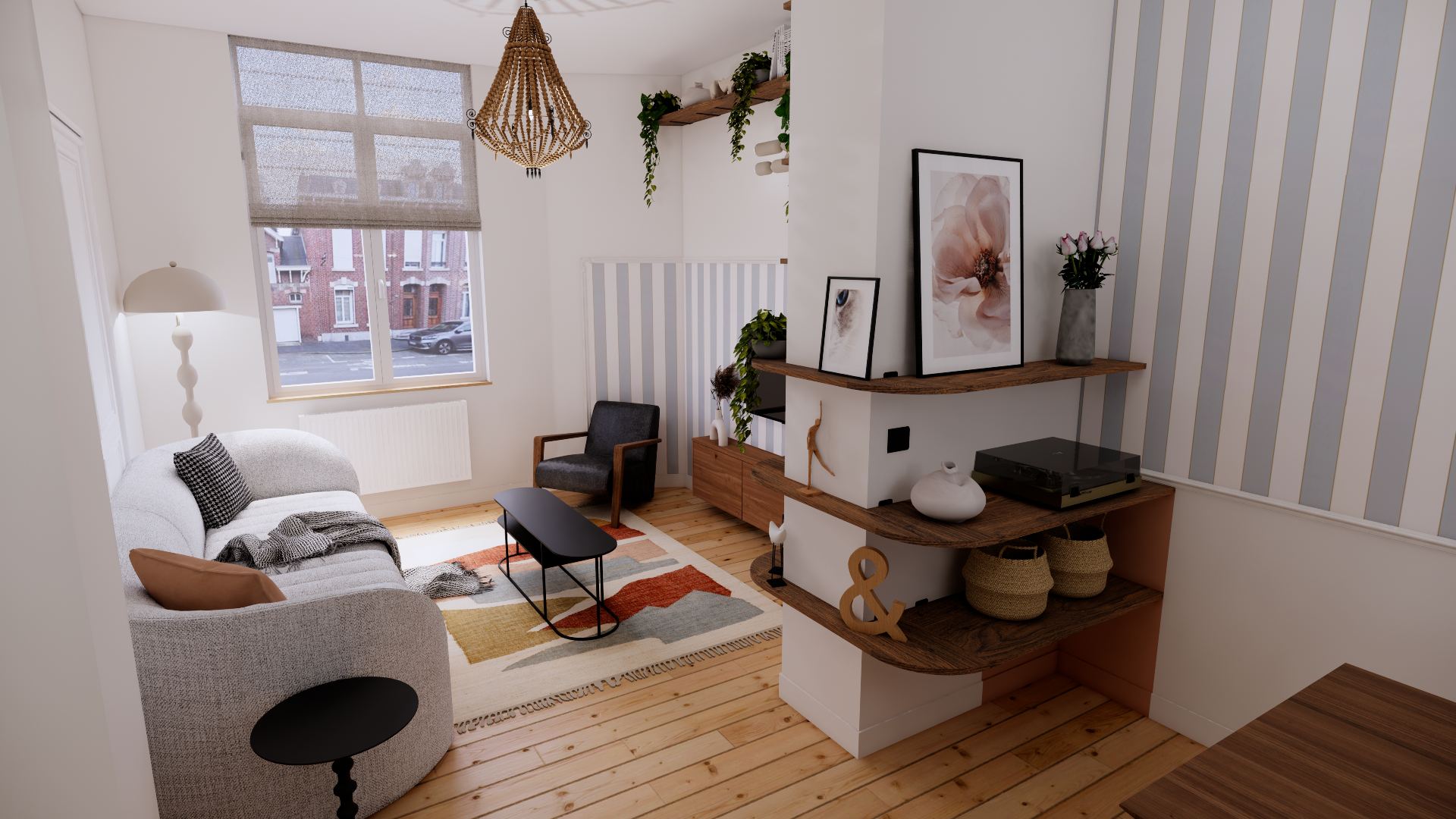 Aménager et décorer leur espace TV tout en faisant le lien vers la salle à manger (poteau à contourner).
