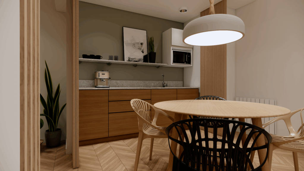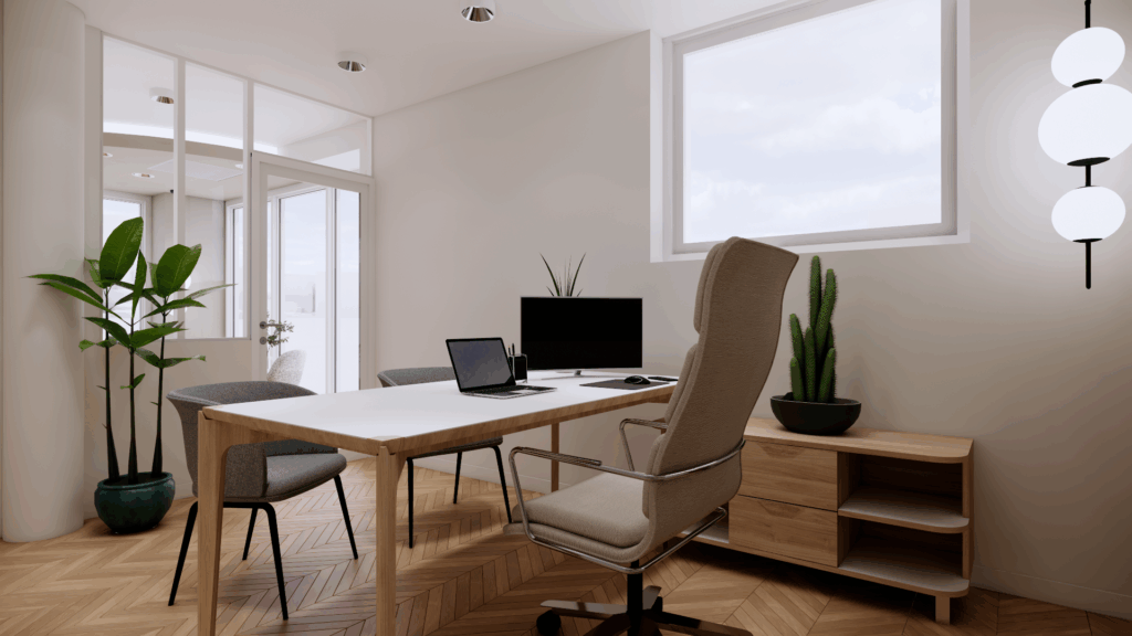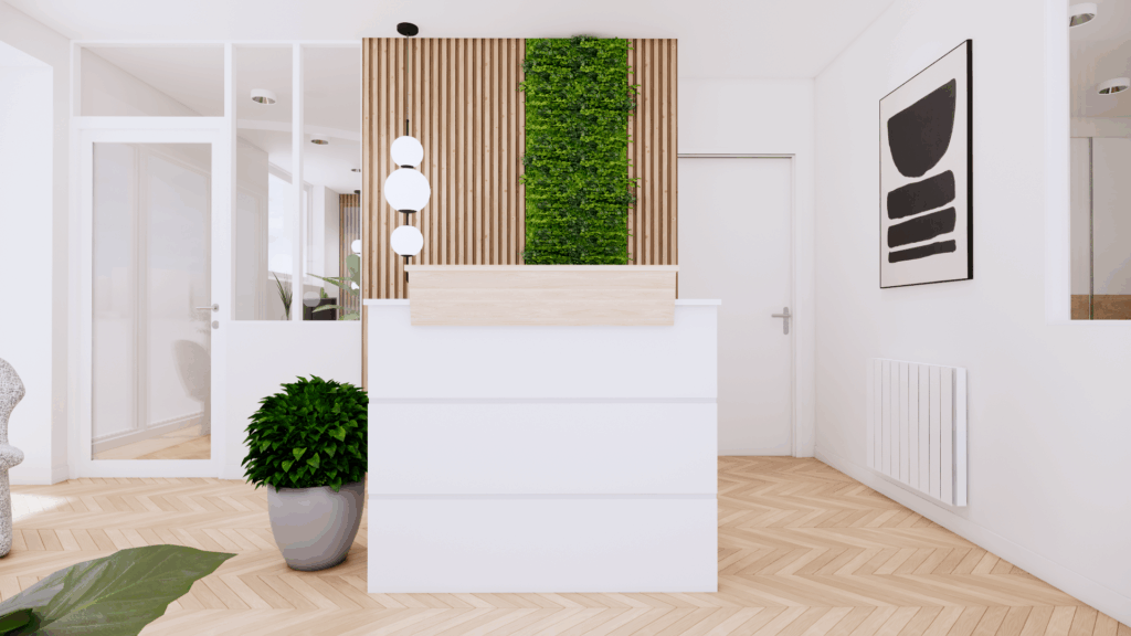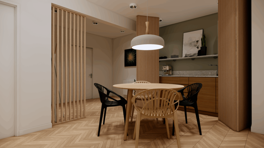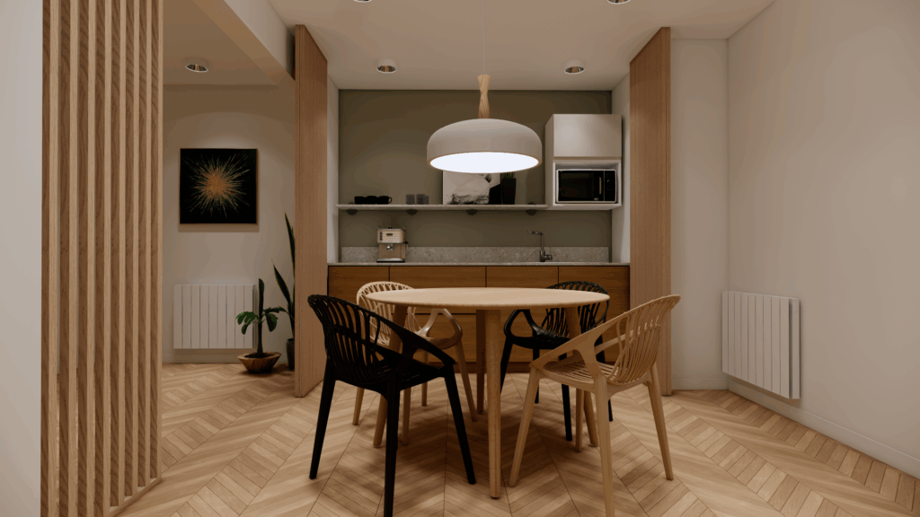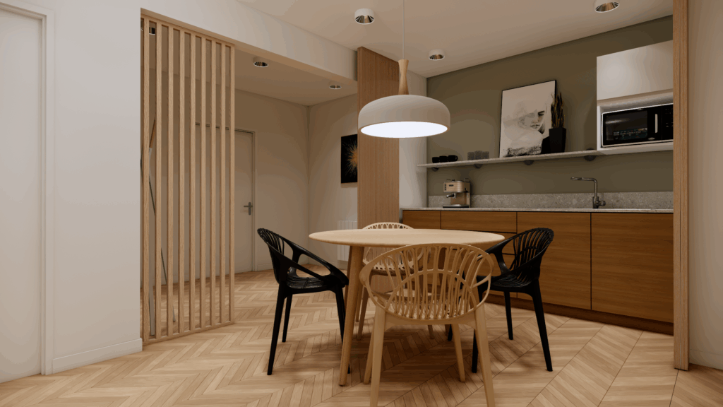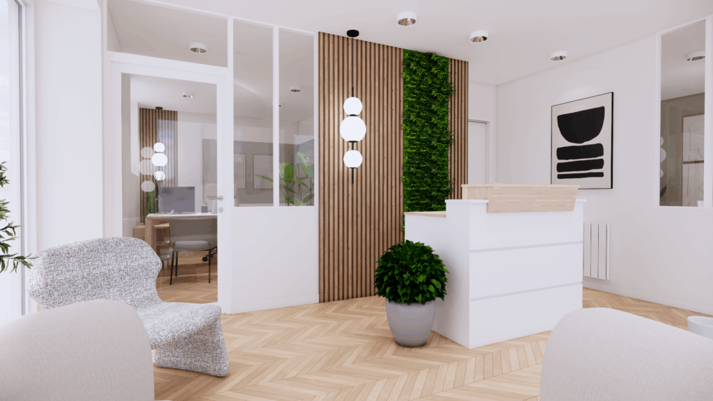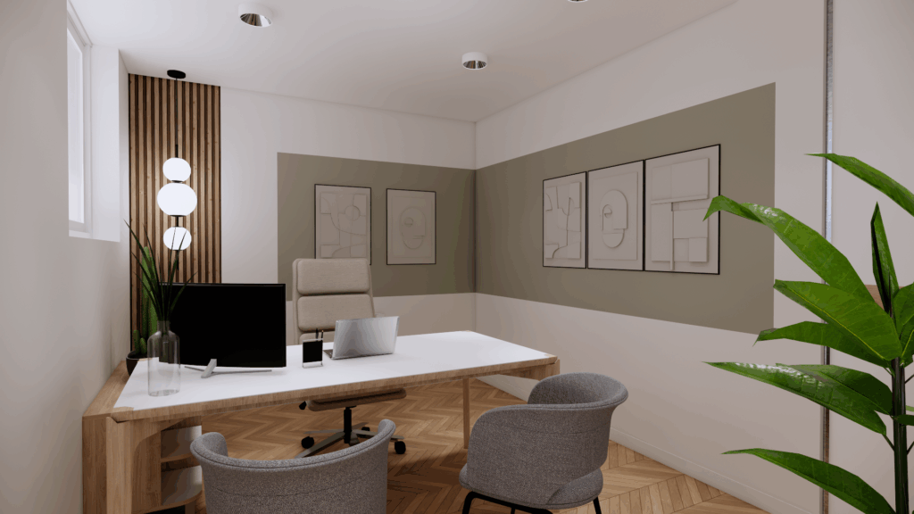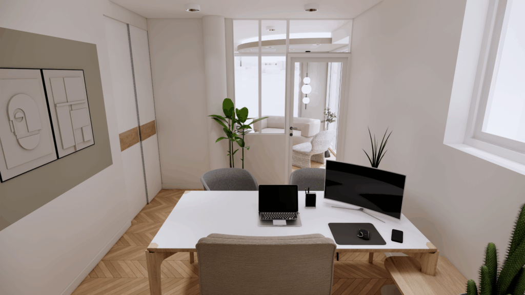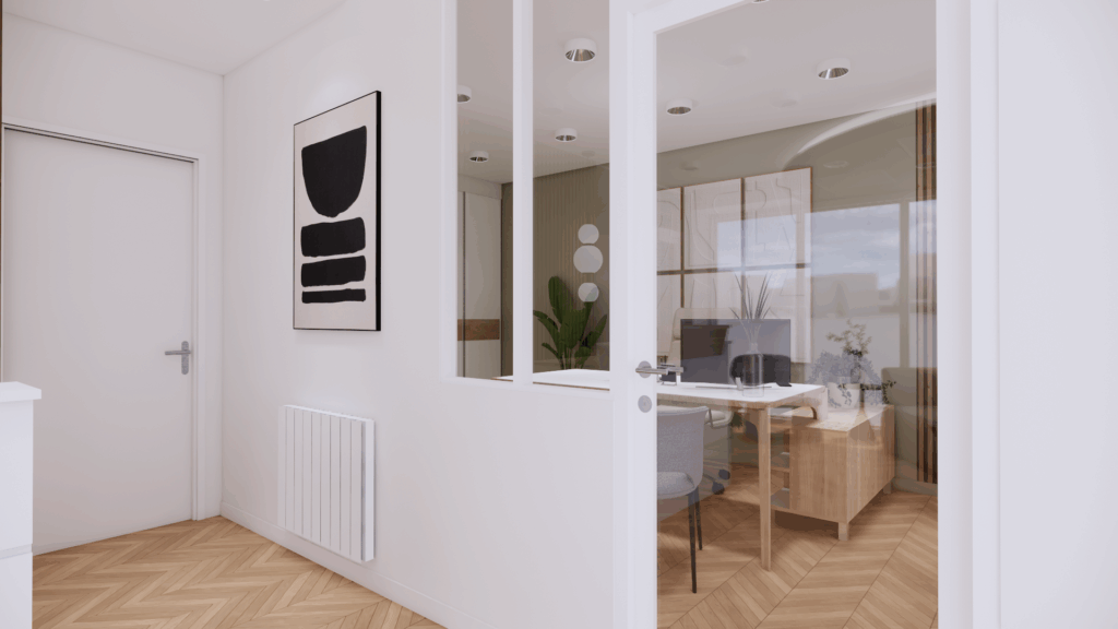 Le travail a été de lever les cloisons pour obtenir une agence avec ses 3 bureaux et sa cuisine/salle de réunion, en respectant l'accès PMR pour l'espace accueil et accès à 2 des bureaux. Il a fallu faire avec les contraintes de poteaux porteurs et les ouvertures existantes. Résultat : des espaces bien proportionnés, et agréables à y travailler.