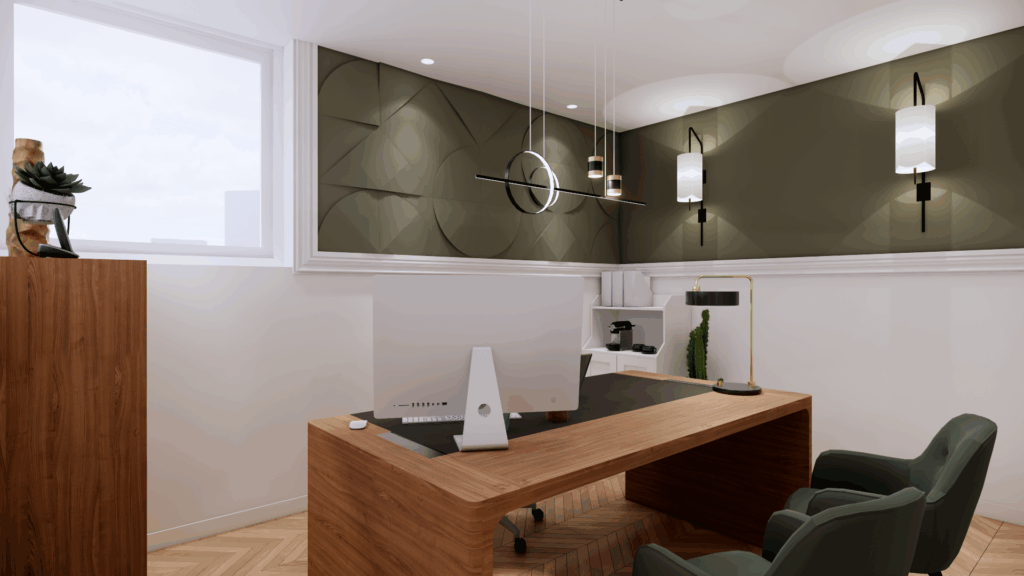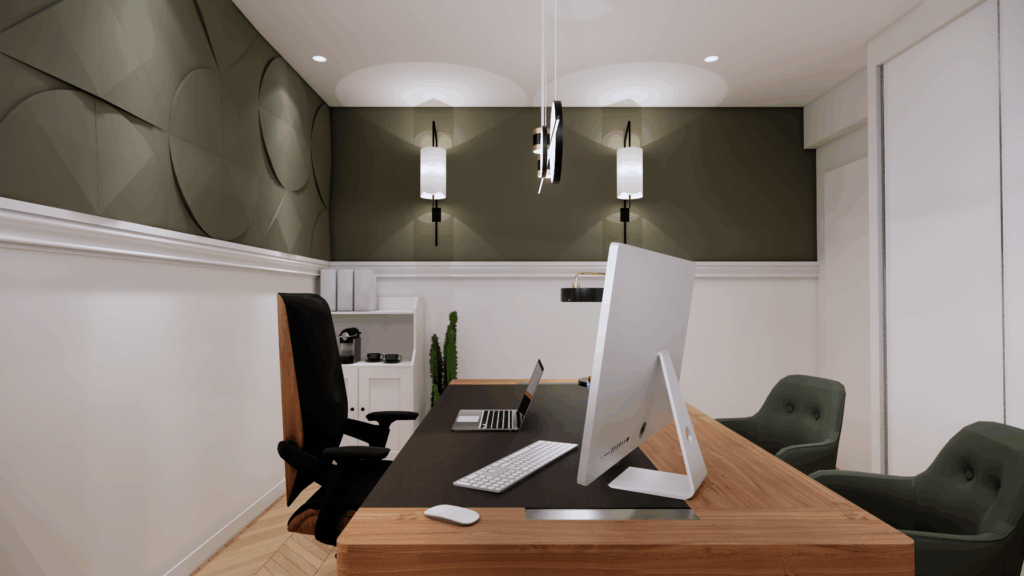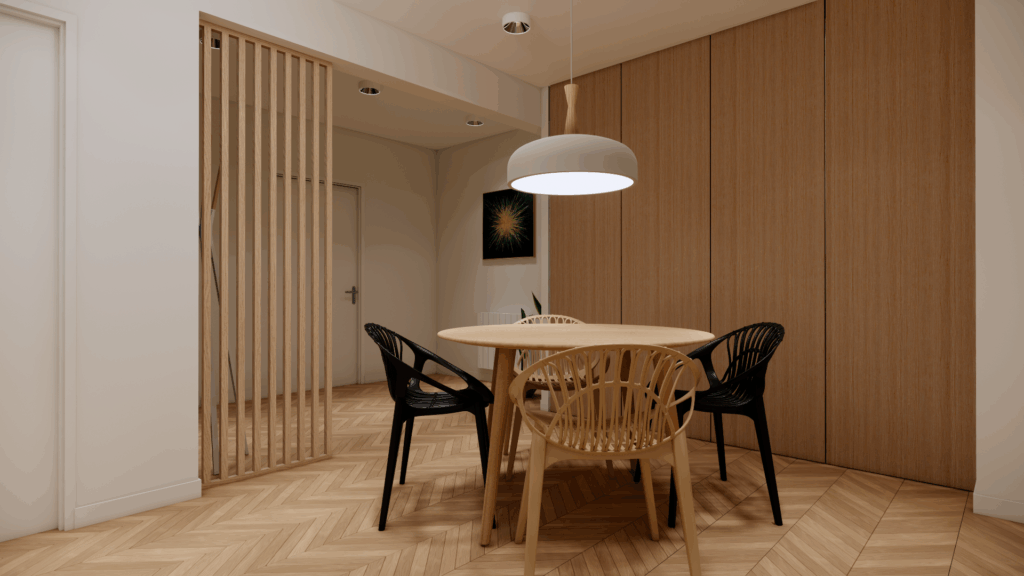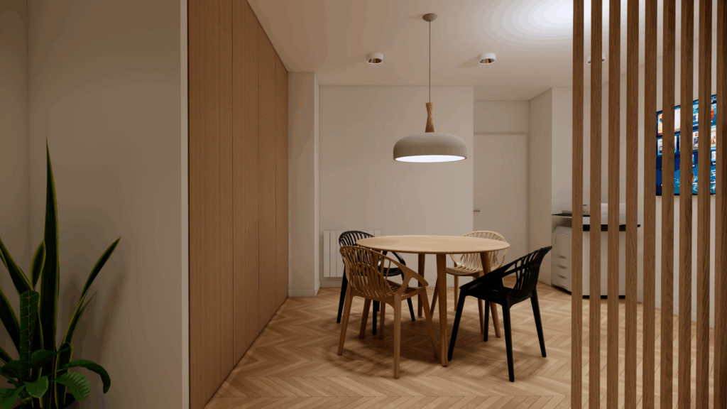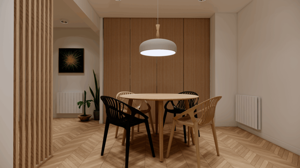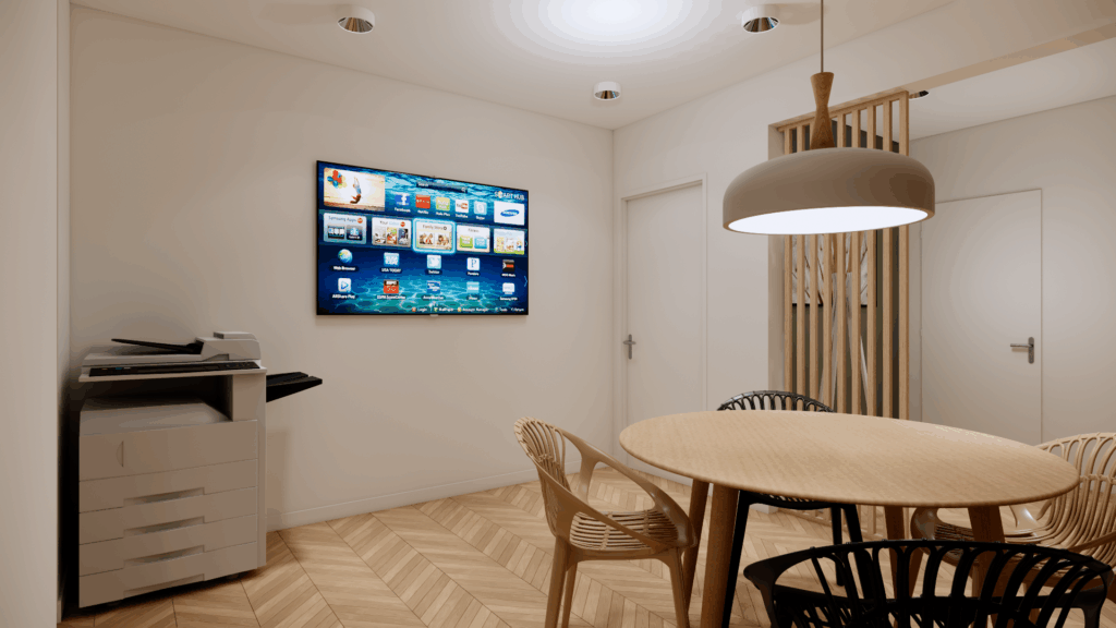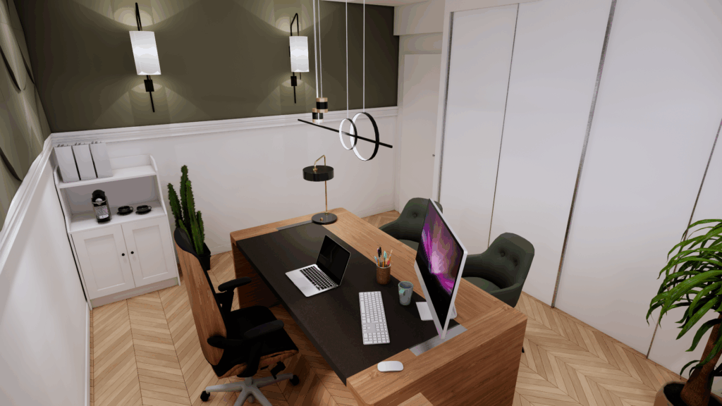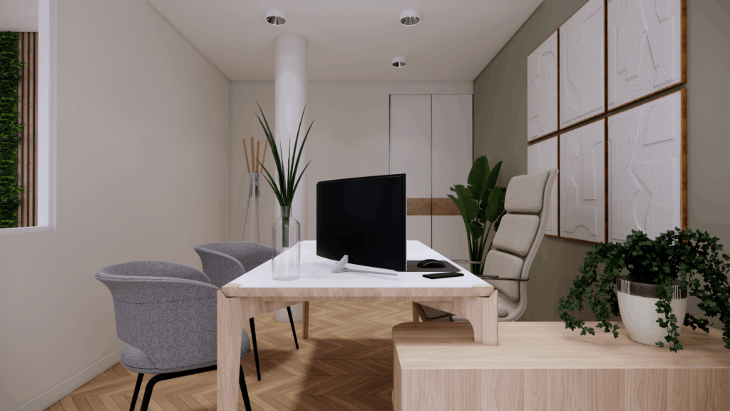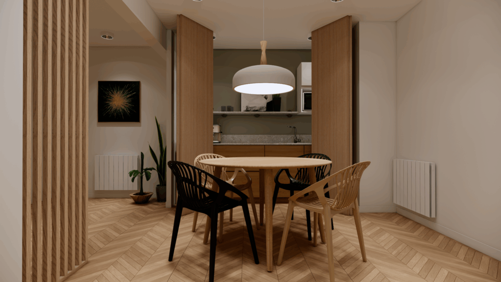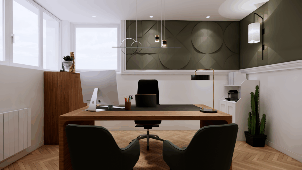 Le travail a été de lever les cloisons pour obtenir une agence avec ses 3 bureaux et sa cuisine/salle de réunion, en respectant l'accès PMR pour l'espace accueil et accès à 2 des bureaux. Il a fallu faire avec les contraintes de poteaux porteurs et les ouvertures existantes. Résultat : des espaces bien proportionnés, et agréables à y travailler.