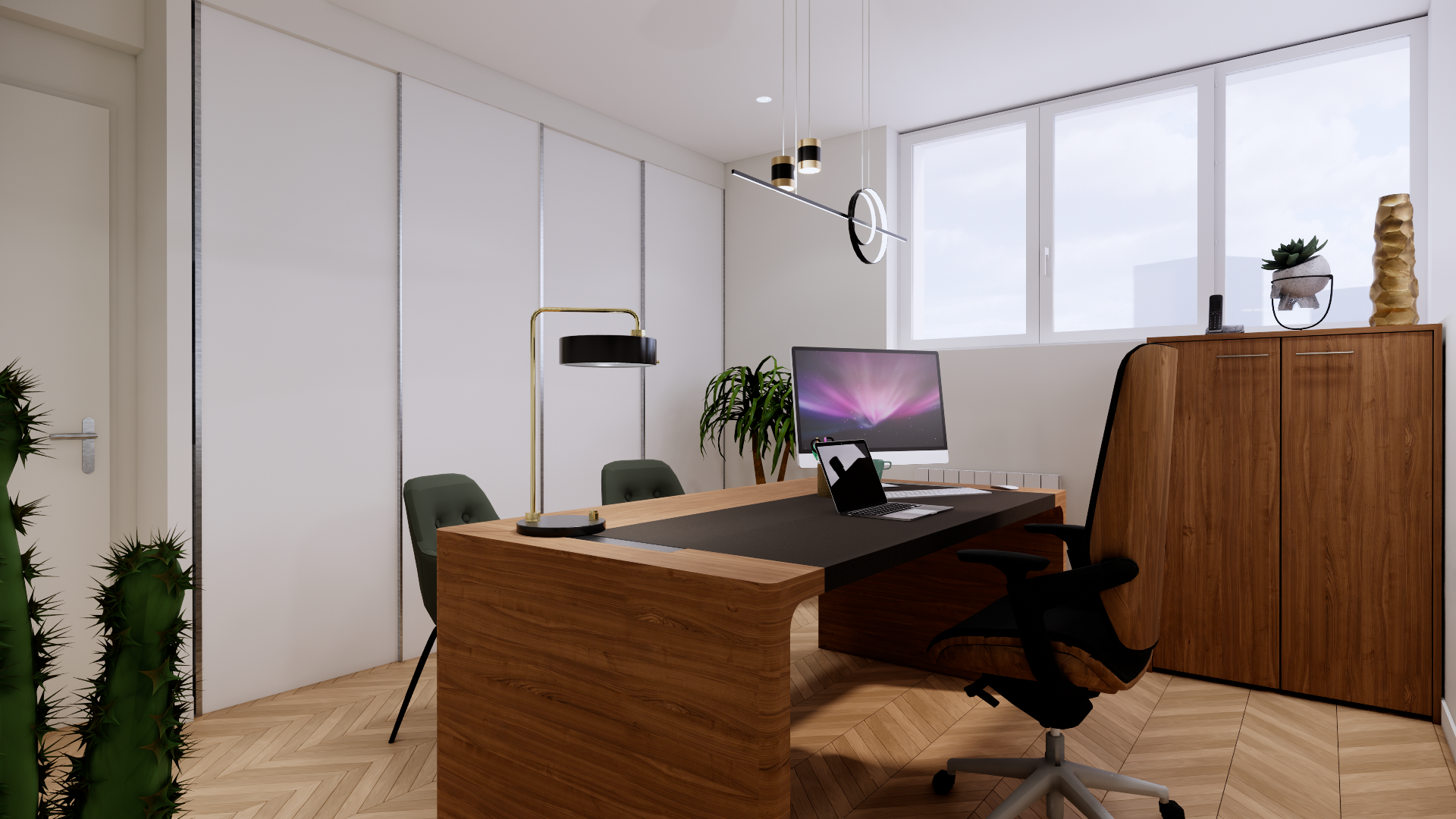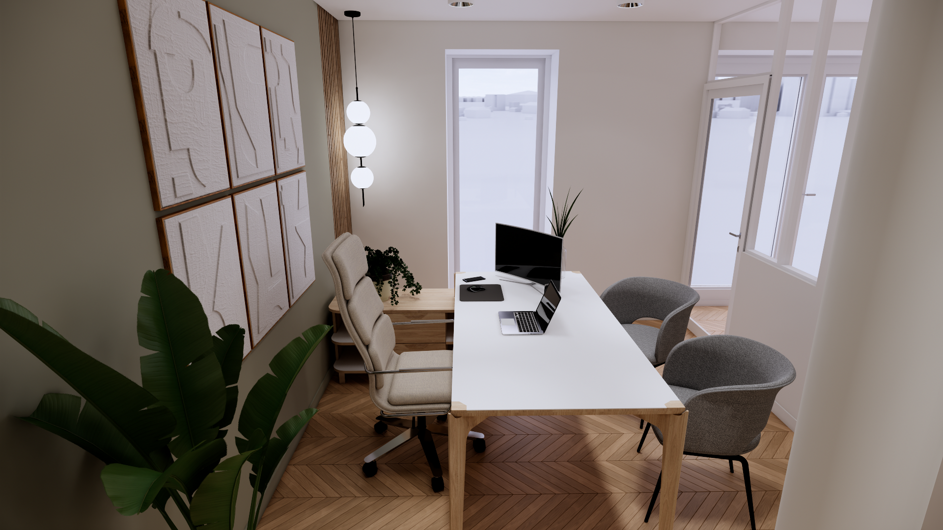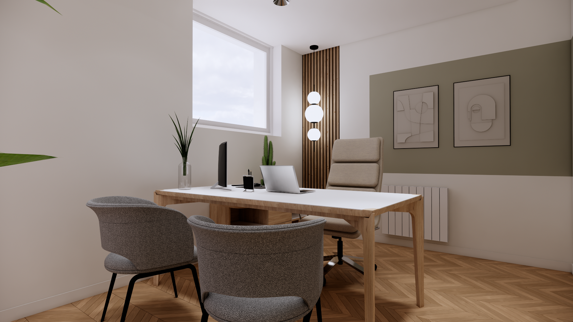 Le travail a été de lever les cloisons pour obtenir une agence avec ses 3 bureaux et sa cuisine/salle de réunion, en respectant l'accès PMR pour l'espace accueil et accès à 2 des bureaux. Il a fallu faire avec les contraintes de poteaux porteurs et les ouvertures existantes. Résultat : des espaces bien proportionnés, et agréables à y travailler.