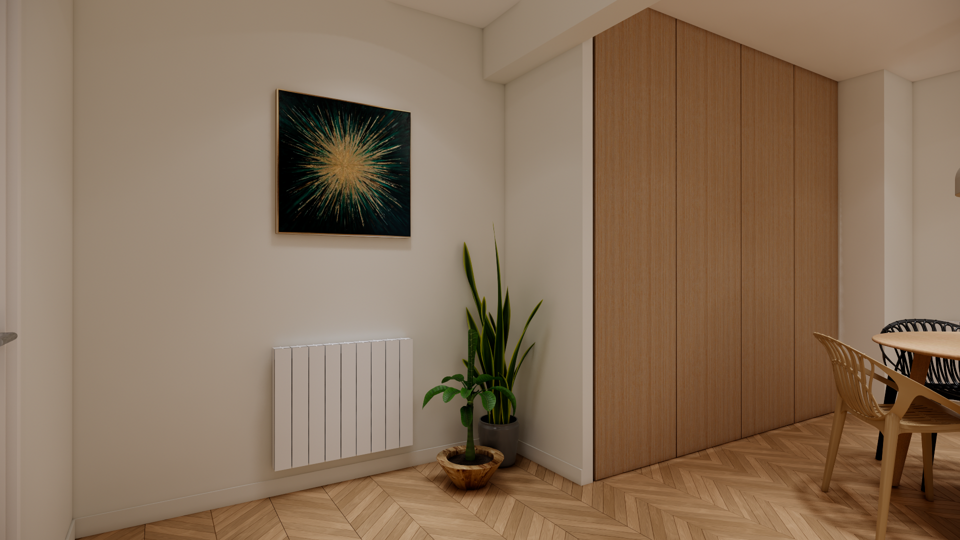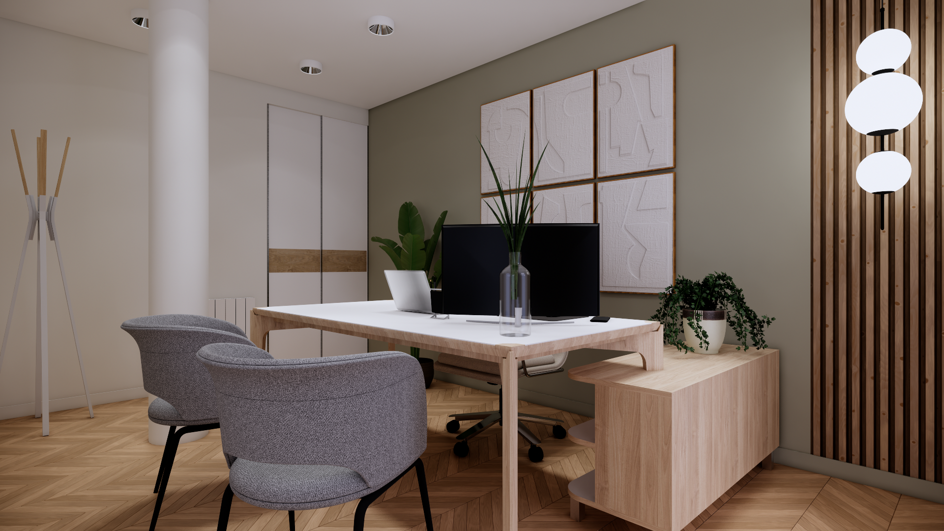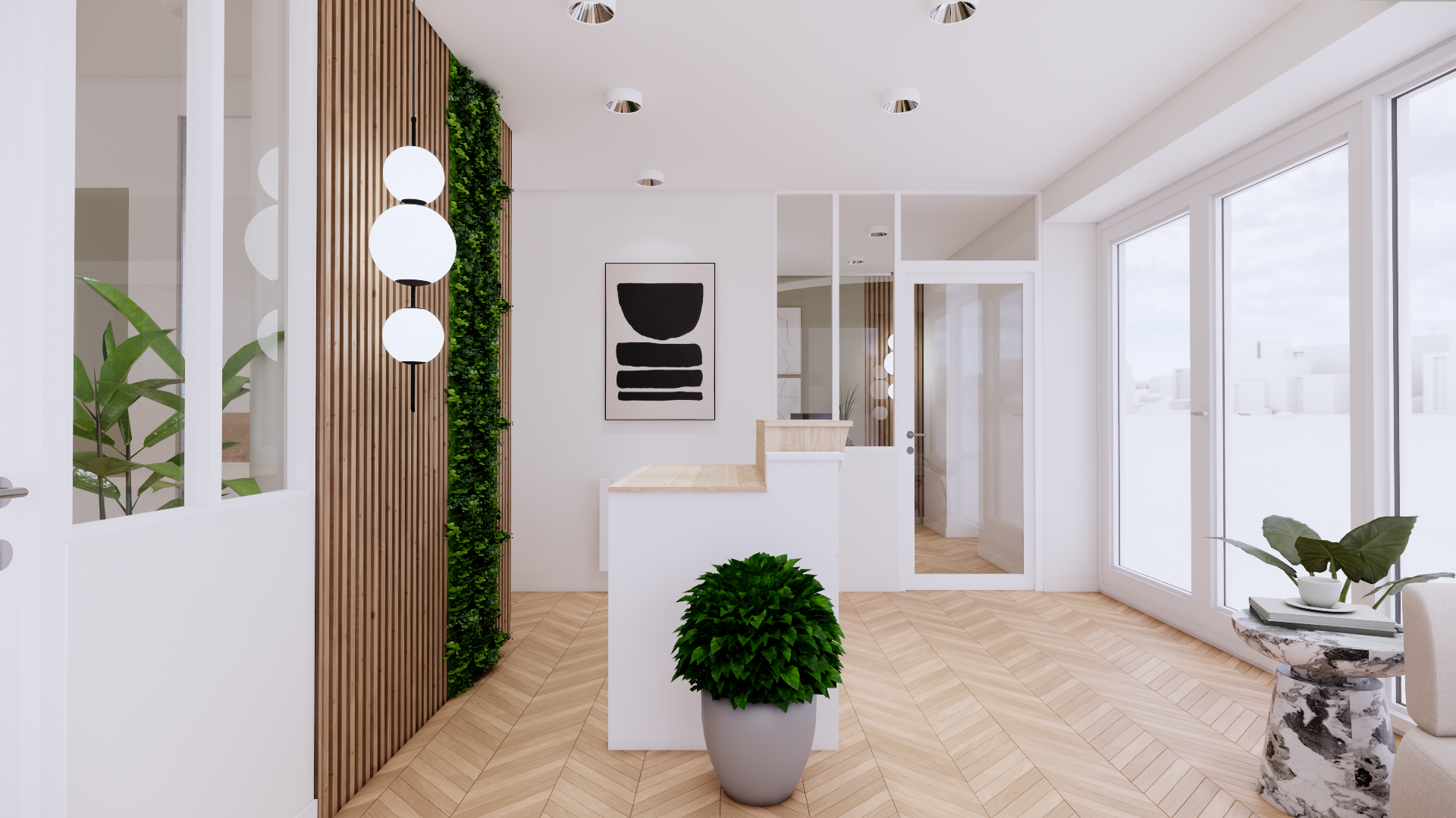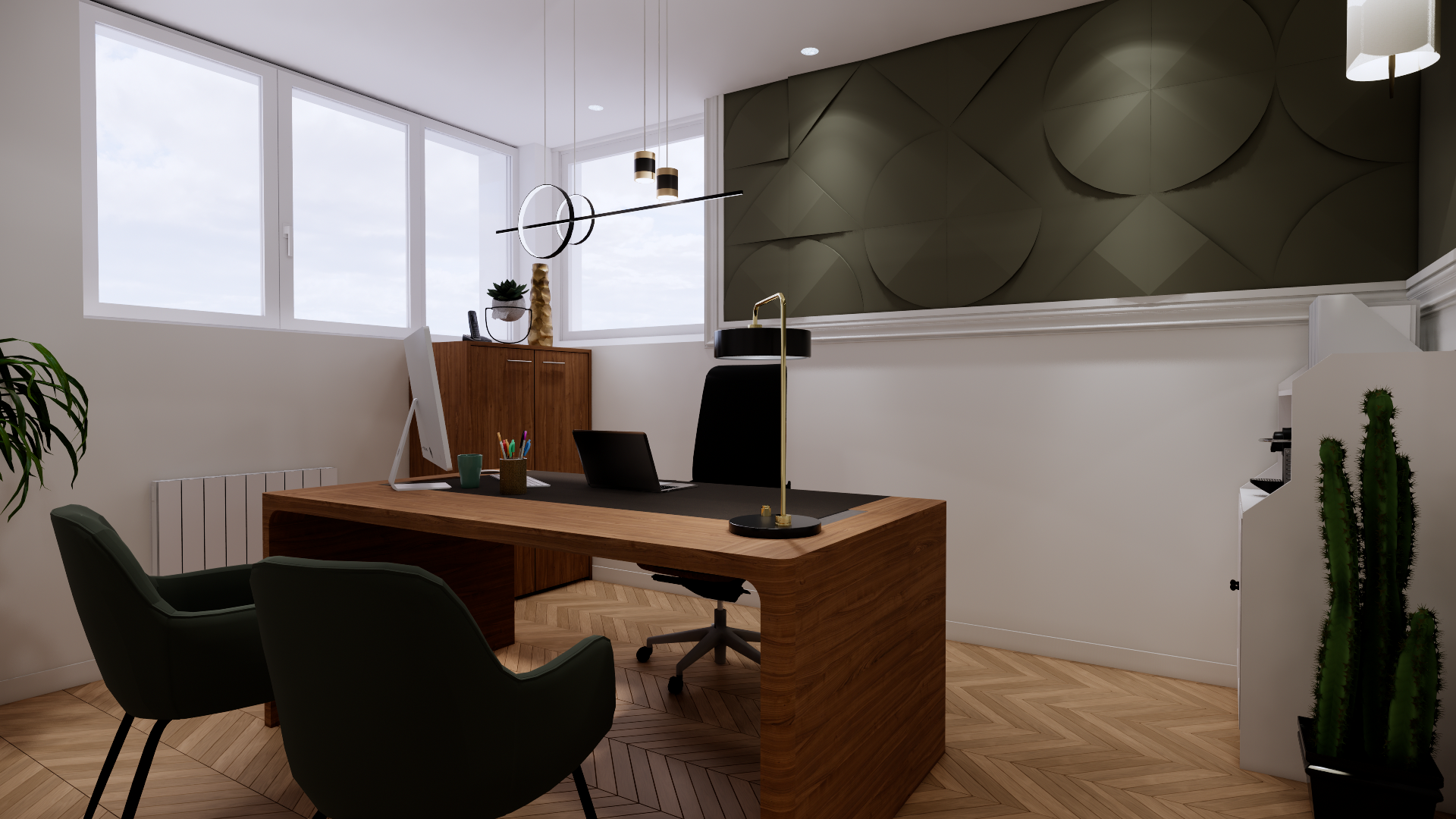 Le travail a été de lever les cloisons pour obtenir une agence avec ses 3 bureaux et sa cuisine/salle de réunion, en respectant l'accès PMR pour l'espace accueil et accès à 2 des bureaux. Il a fallu faire avec les contraintes de poteaux porteurs et les ouvertures existantes. Résultat : des espaces bien proportionnés, et agréables à y travailler.