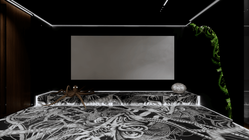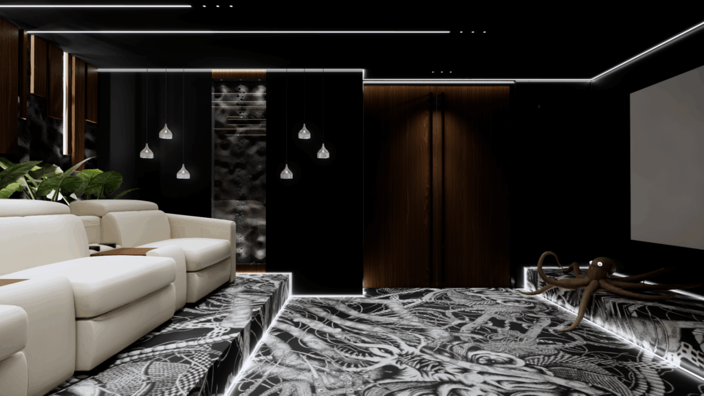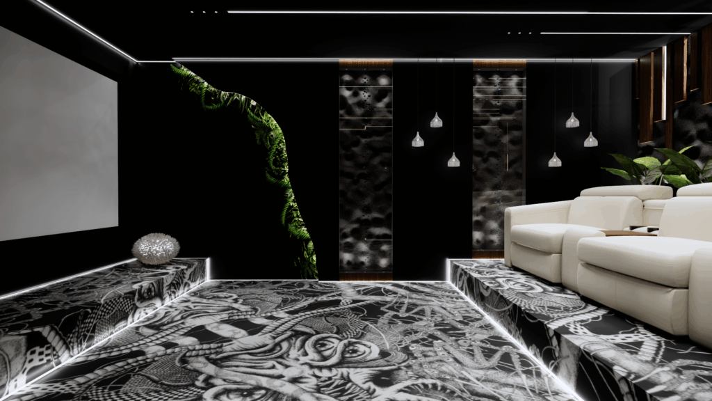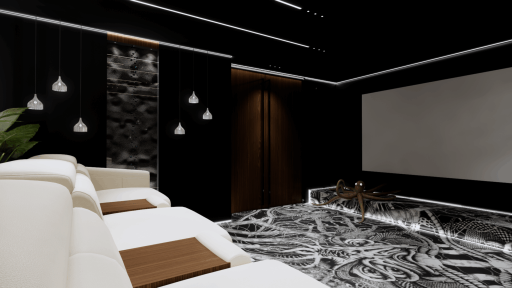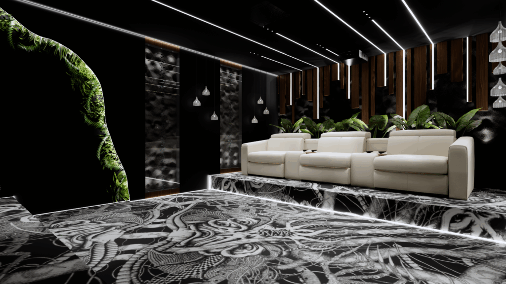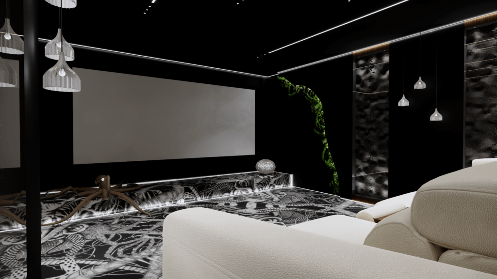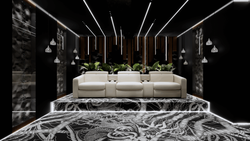 Créer une ambiance unique pour cette salle de cinéma où les clients pourront tester le son et l'image en immersion.