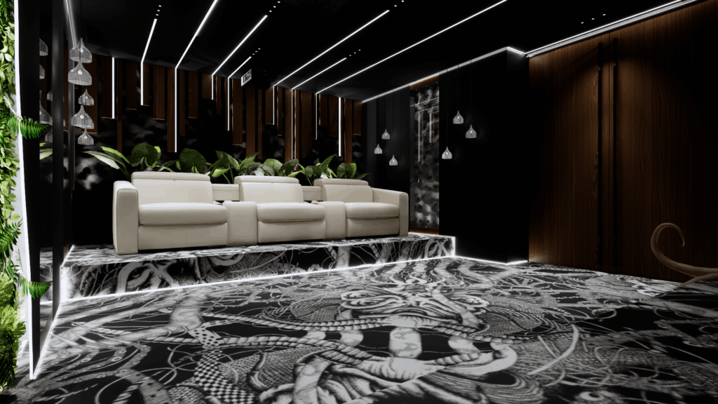 Partir de la moquette à motifs pour décliner l'ensemble de l'ambiance de cette salle. Un univers particulier où les clients seront transportés dans un autre monde. Et tout un jeu d'éclairage indirect pour tamiser la pièce et profiter pleinement du film diffusé.