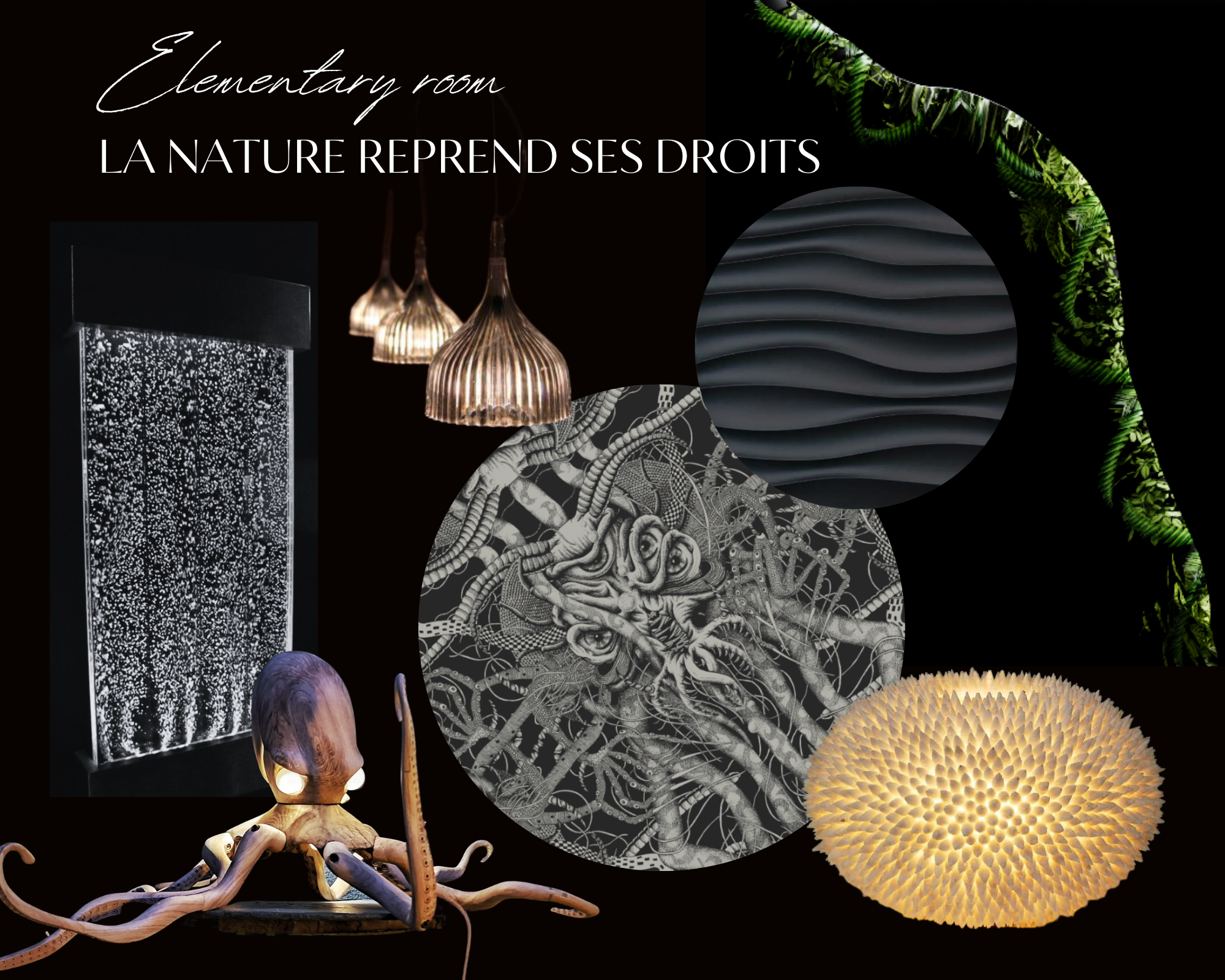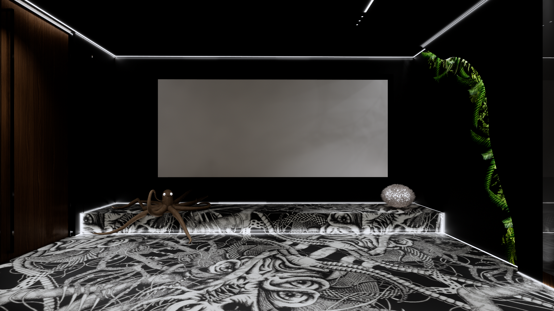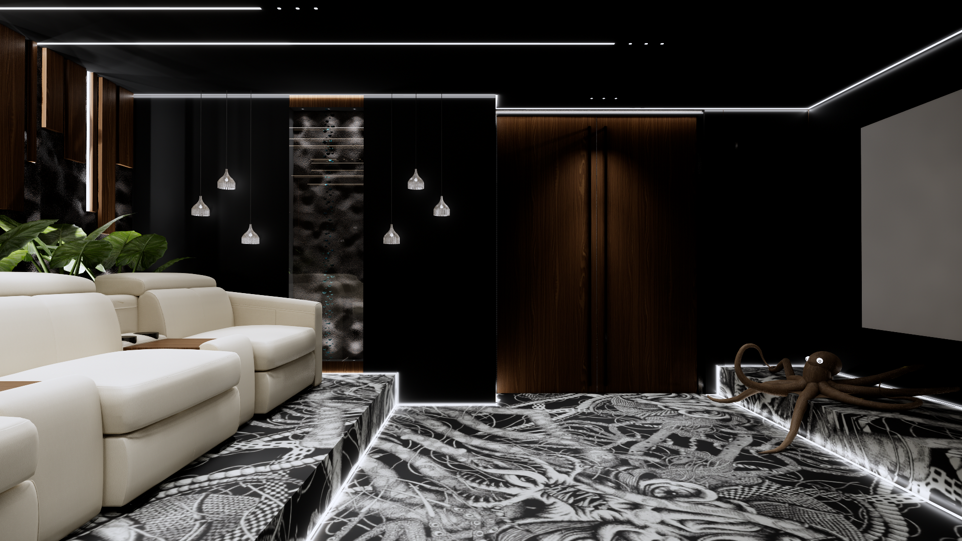 Partir de la moquette à motifs pour décliner l'ensemble de l'ambiance de cette salle. Un univers particulier où les clients seront transportés dans un autre monde. Et tout un jeu d'éclairage indirect pour tamiser la pièce et profiter pleinement du film diffusé.