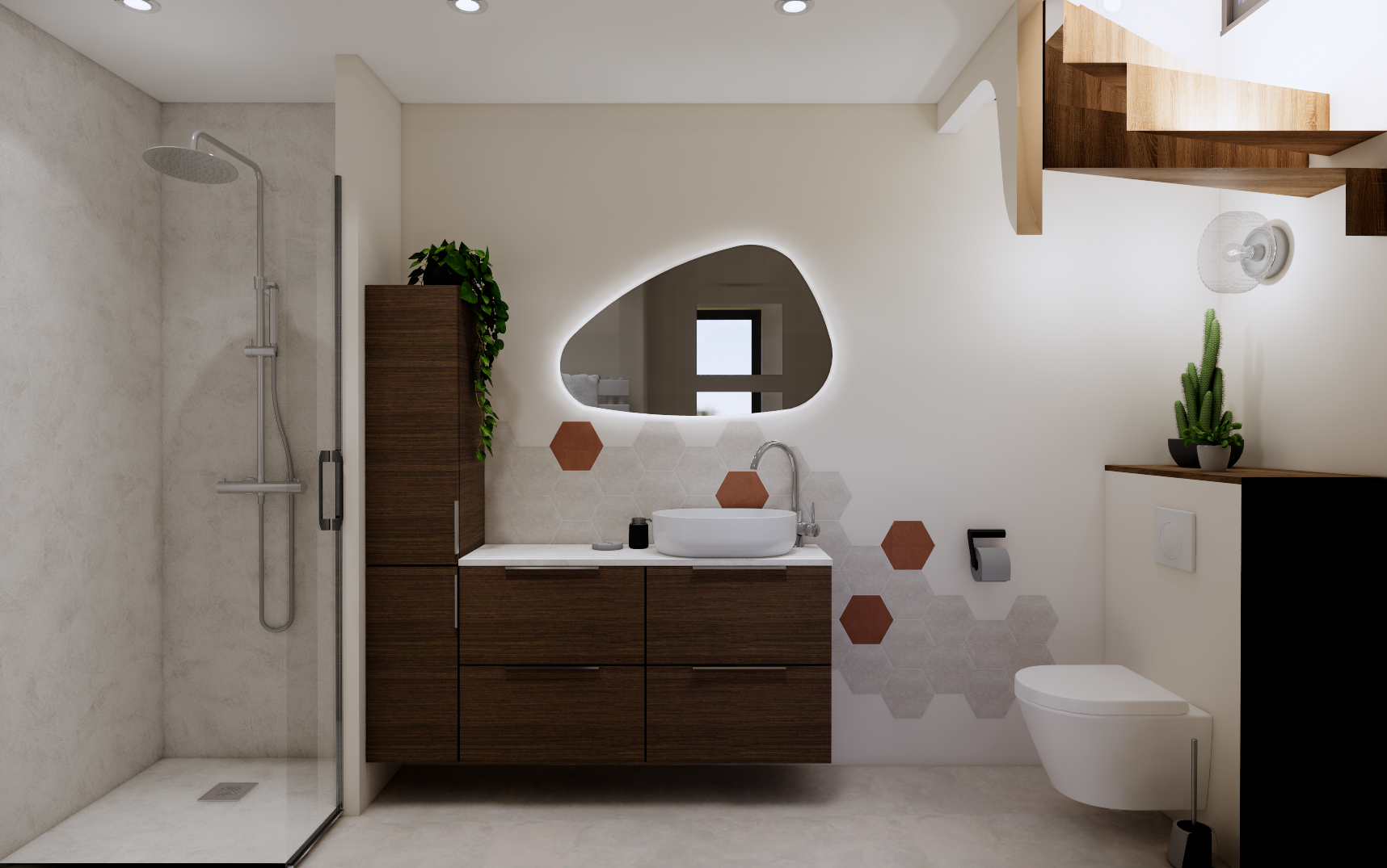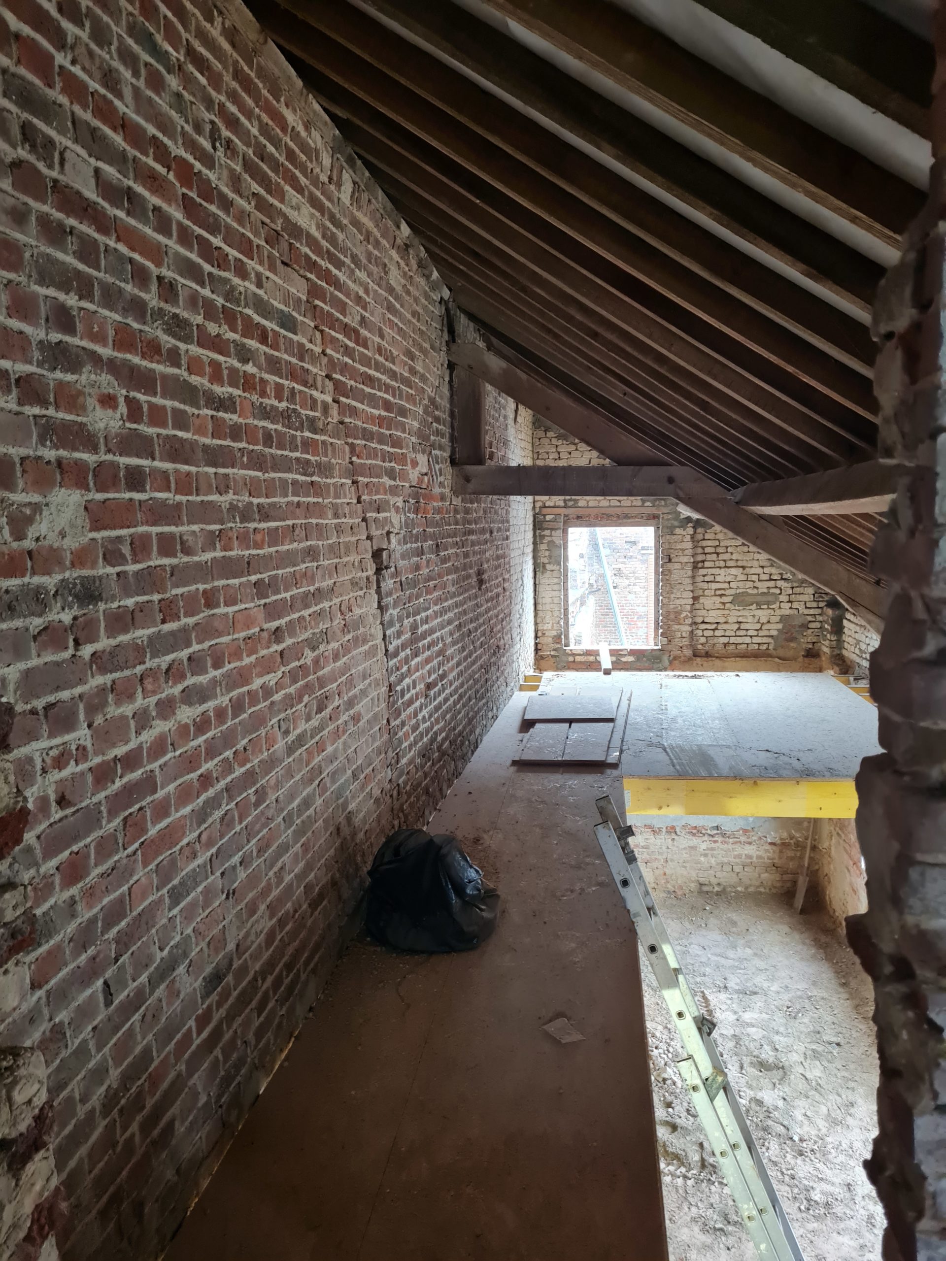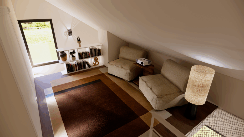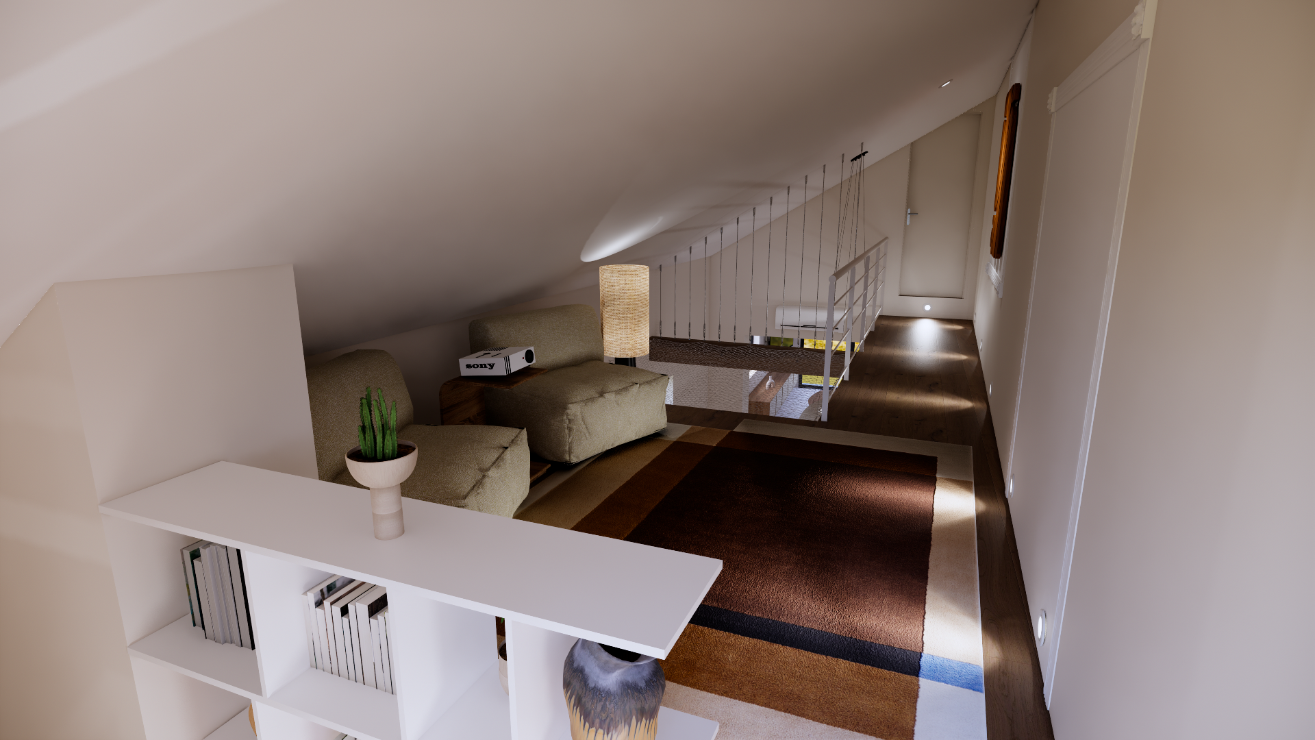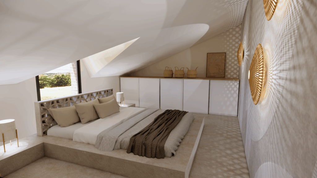 Tout était à créer à partir d'une page blanche. Souhait d'y intégrer une seule chambre et une salle de bain, qui étaient destinées à être à l'étage. Mais suite à ma visite, je n'ai pas validé leur disposition car en comptant l'épaisseur de l'isolation, la partie mezzanine était juste inexploitable pour l'implantation d'une salle de bain.