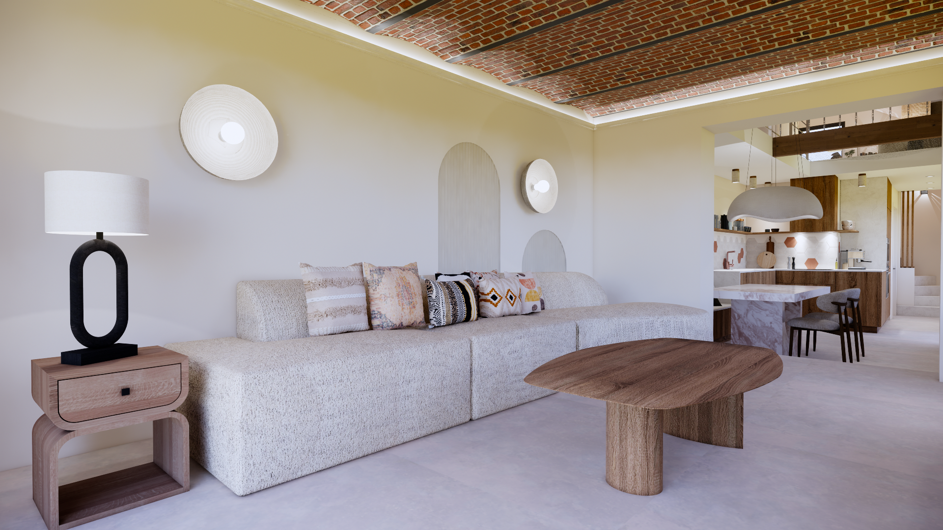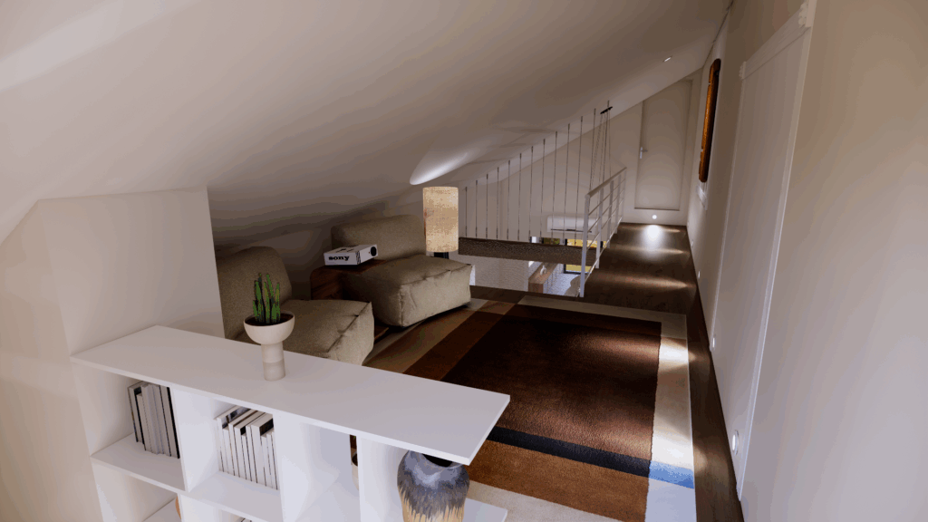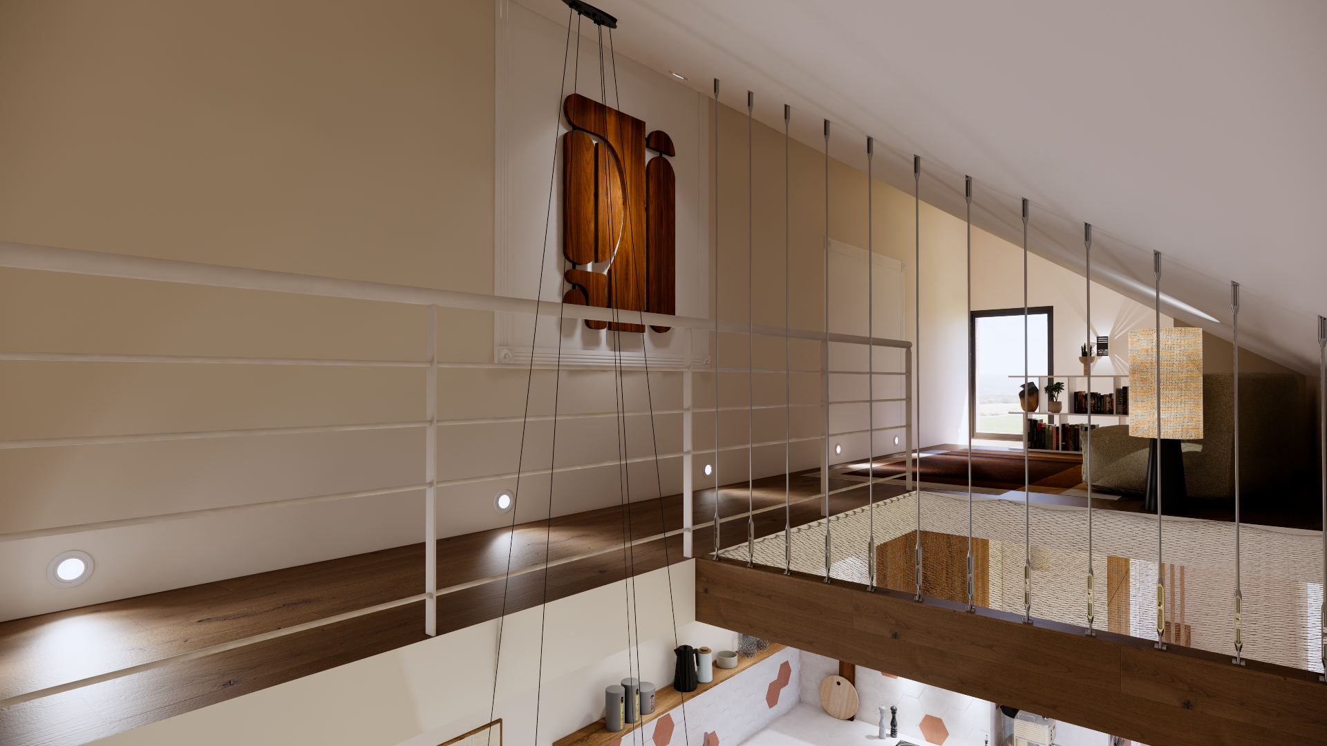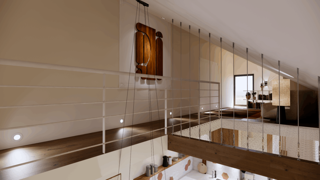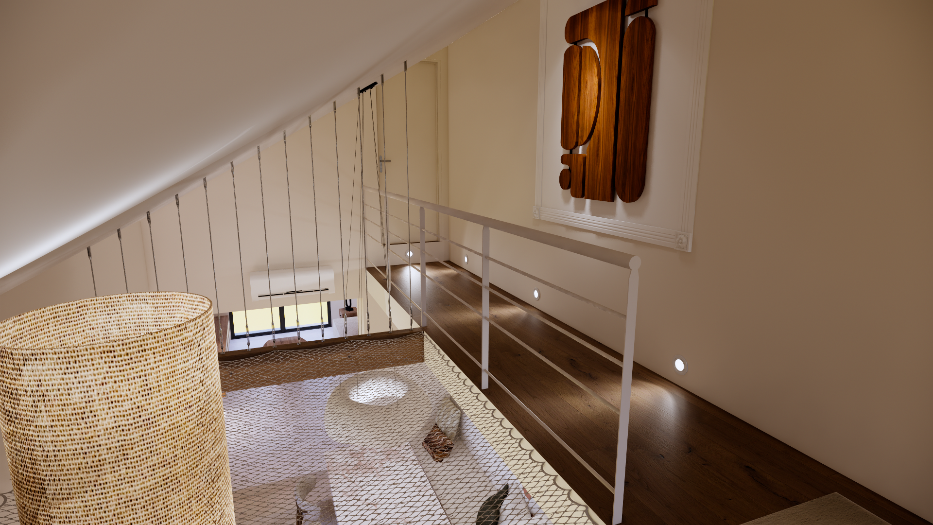 J'ai dû travailler sur des plans d'aménagement au préalable et coup de cœur l'une des solutions, celle présentée dans cet article avec une cuisine en angle ouvert, ce côté traversant de l'habitation, un espace détente au niveau de la mezzanine et une décoration soignée et intemporelle.
