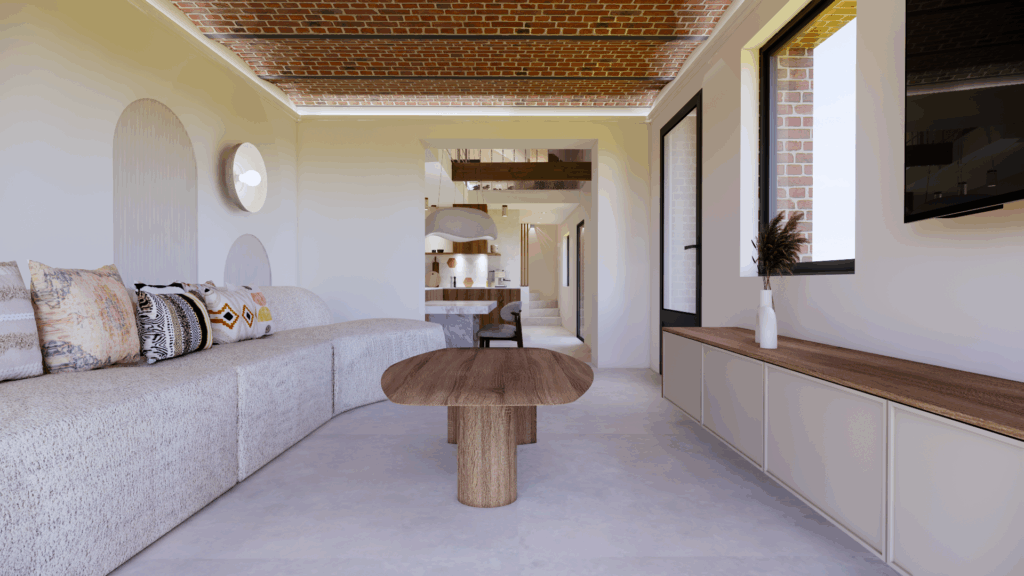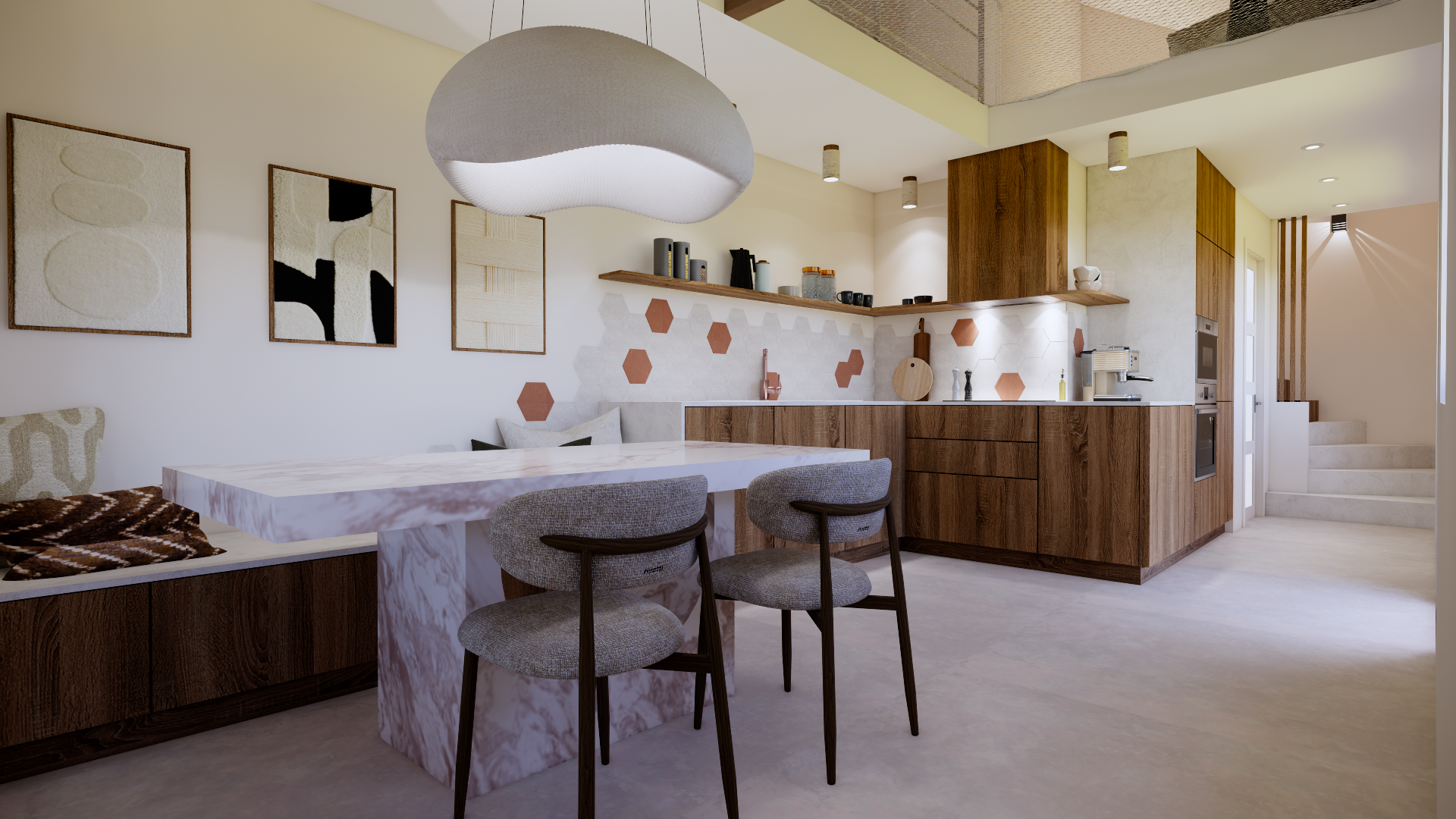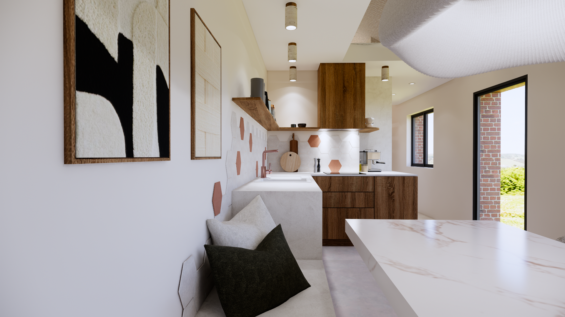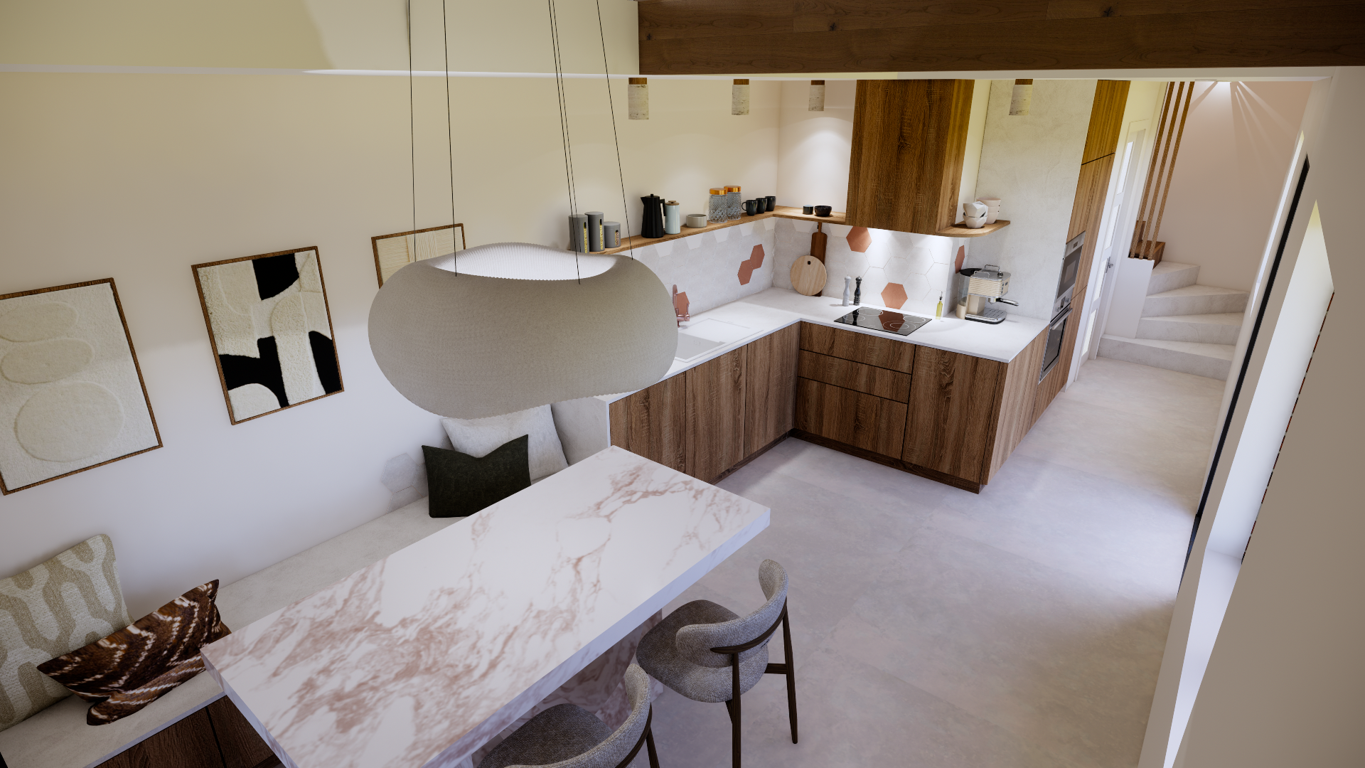 J'ai dû travailler sur des plans d'aménagement au préalable et coup de cœur l'une des solutions, celle présentée dans cet article avec une cuisine en angle ouvert, ce côté traversant de l'habitation, un espace détente au niveau de la mezzanine et une décoration soignée et intemporelle.