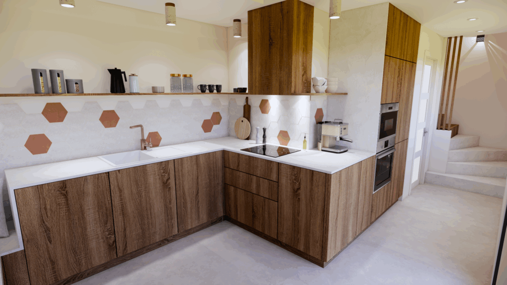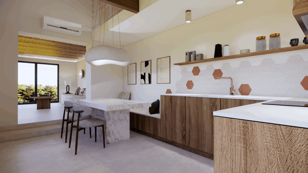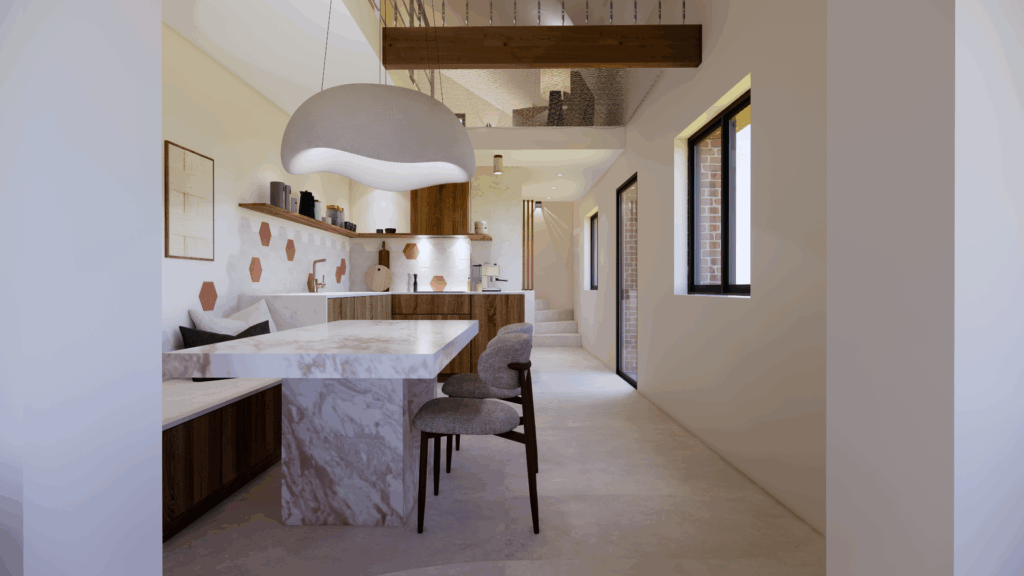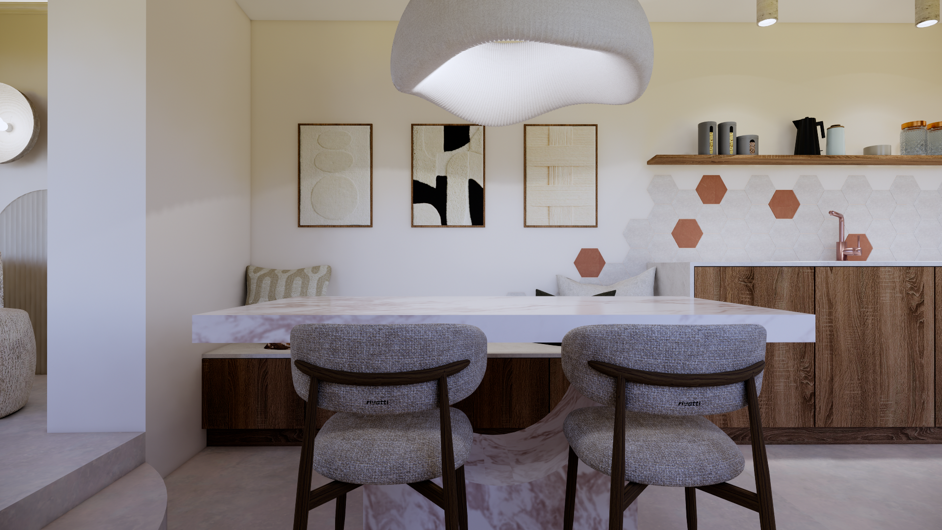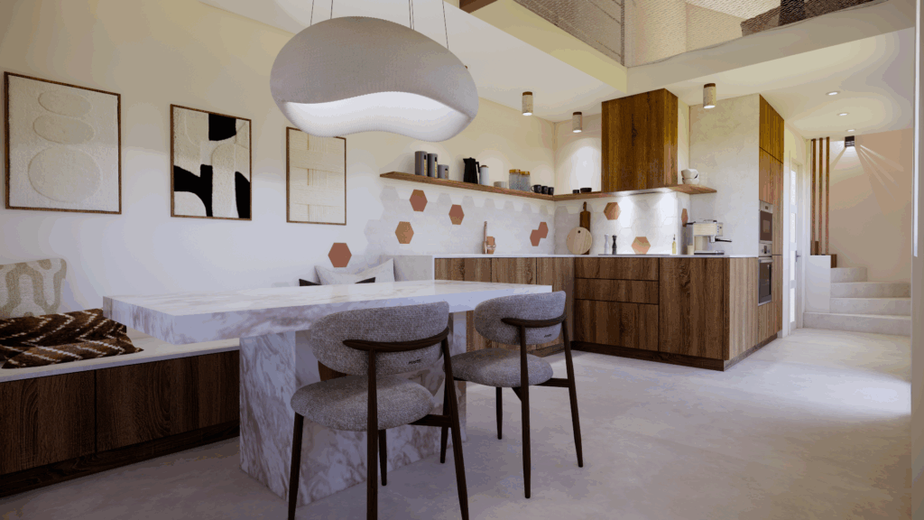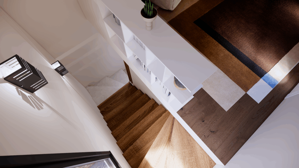 J'ai dû travailler sur des plans d'aménagement au préalable et coup de cœur l'une des solutions, celle présentée dans cet article avec une cuisine en angle ouvert, ce côté traversant de l'habitation, un espace détente au niveau de la mezzanine et une décoration soignée et intemporelle.